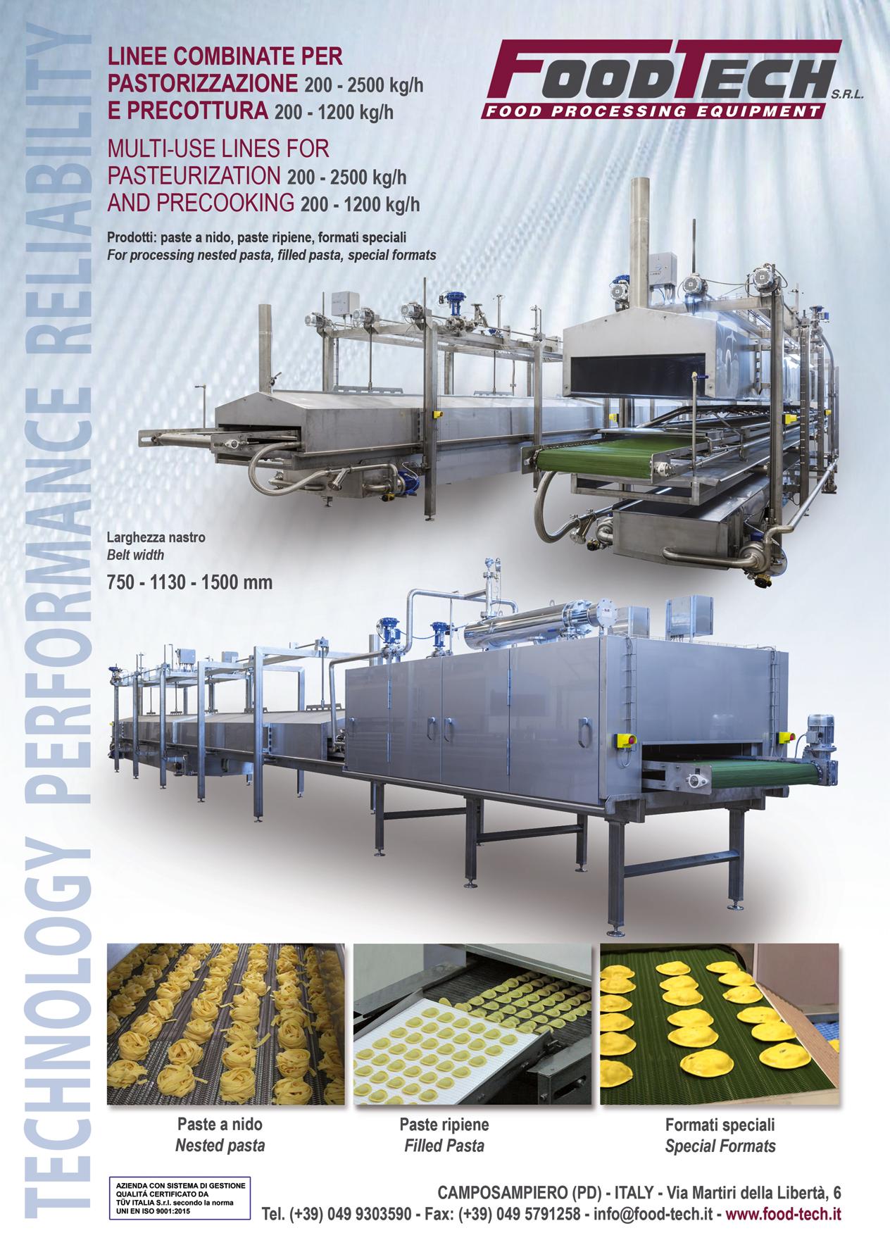 tinuazione alimenti diversi (paste, riso, carni, verdure ecc.), particolarmente studiato per piatti pronti a base di pasta. A monte gli impianti si completano di macchinari per produrre paste estruse, laminate e ripiene che possono essere trasformate in piatti pronti completi di condimenti: formati, gusti, confezioni per mercati diversificati. A valle tutti i sistemi di dosaggio dei condimenti, assemblaggio in vaschetta e confezionamento. Il consumatore avrà la possibilità di gustare molte ricette di piatti pronti da riscaldare o cuocere, freschi o surgelati per la massima comodità.
