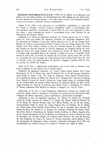 Reuniones Ornitológicas de la S. O. P.- Como ya se expresa en la Memoria que aparece en este mismo número, las disertaciones han sido escasas por las dificultades de local durante los últimos tiempos. Con todo hemos contado con excelentes disertaciones, cuyos títulos y asistentes damos a continuación: Agosto 19 de 1940. - «La psitacosis en la República Argentina », a cargo del Dr. Niceto S. Lóizaga. Nuestro consocio, distinguido médico y bacteriólogo, hizo una excelente exposición, comentando el último brote de este mal, aparecido en Buenos Aires y cuya investigación oficial le correspondió hacer como director de los laboratorios del Hospital Muñiz. Asistieron a la misma las siguientes personas: Sr. Tomás Aguilar, Sr. A.• T. Althaparro, Sr. Luis Aris Russo, Sr. Salomón Averbach, Sr. Francisco Basterreix¡ Ora. D. Giambiagi de Oalabrese e hijo, Srta. Elvira Camaveio, Sr. E. M. del Campo, Prof. Roberto H. Capurro, Contralmirante Pedro S. Casal y Sra., Dr. Jorge Casares, Sr. Cella Tomba, Prof. Luis Alberto Chillida, y Sra., Sr. Alfonso Condró, Sr. Jorge Cranwell, Sra. Carlota de Crouciño Linares, Sr. Juan B. Daguerre, Sr. Delgado Gamez, Sr. Arís" tides De Greco, Dr. Jorge Dennler, Sra. Carolina M:. Kirley de Elías, Dr. Roberto J". Fanelli, Ing. Fernández Blanco, Sr. Alfredo J. Figini, Sr. León A. Gallardo. Prof. Héctor S. Gavio, Sra. de Geerts, Sr. Alberto M. Gowa, Srta. Emma Lemi, Sra. de Loi· za y hermana, "Sr.• Tosé Loizaga, Dr. Jorge Nolman, Srta. María Luisa Paz, DI' José A. Pereyra y Sra., Dr. Isidro Ramírez, Sr. R,amón J. Roggero, Capellán José M. Suárez García, Sr. Andrés M. Wilson. Junio 19 de 1941. -« Miscelánea ornitológica », por el Dr. José A. Pereyra, cuyo texto se publica en este número con el mismo título. Asistieron los siguientes consocios: Sr. Arturo Tomás Leslie Atkins, Prof. Irene Bernasconi, Sr. H. E. Brain, Ing. José M. Bustillo, Sr. E. M. del Campo, Contralmirante Pedro S. Casal y Sra., Sr. Juan B. Daguerre, Prof. Martín Doello-.Turado, Sra. Carolina M. Kirley de Elías, Dr. Alberto E. J. Fesquet, Prof. Abraham Freiberg, ProL Héctor S. Gavio, Sr. Axel G. Krebs, Sr. Jorge Landr Dessy, Sr. Salvador Magno, Sr. Andrés Millé, Sr. Gustavo Muniz Barreto, Sr. Eduardo Muñoz, Sr. Raúl Julián Angel Nicolini, Sr.Celia B. de Pereyra, Dra. María Juana 1. Pergolani, Sr. Alberto P. Prosen, Almirante Abel Renard, Sr. Ramón J. Roggero, Sr. Juan B. Vasco. Septiembre 26 de 1941. - «Los Carpinteros argentinos », dictada por nuestra consocia Dra. María Juana 1. Pergolani e ilustrada con material de las Colecciones Orni· tológicas del Museo Argentino, piezas anatómicas y proyecciones luminosas. Asistieron al acto las siguientes personas: Sr. Alberto N. Aiello, Sr. Armando Arata, Sr. Pelipe Armoin, Sr. Arturo T. L. Atkins, Sra. Muriel Ayses de Bruzon, Sr. H. E. Brain, Sr. Thomas Bruzon, Ing. José María Bustillo, Sr. E. M. del Campo, Contralmirante Pedro S. Casal, Dr. Jorge Casares, Sra. de Chillida, Dr. E. Dallas, Sr. Carlos Dasso, Prof. Martín Doello-Jurado, Sr. Ian G. Drysdale, Sra. Carolina M. Kirley de Elías, 01'. Alberto E. J. Fesquet, Sr. Abraham Freiberg, Sr. Rubén Gerbelini, Prof. Berta S. Gerschman, Sr. Dundley Dendle Godfrey, Sr. Pablo Gregorio Haedo, Sr. Carlos Havenstein, Sr. H. R. Hudson, Sra. Kliman, Sr. Axel G. Krebs, Sr. Juan P. Larraburo, Sr. Salvador Magno, Sr. Gustavo Muniz Barreto, Dr. José M. Pereyra, Sr. Neo Pergolani, Sr. Pozzo, Sr. Alberto F. Prosen, Almirante Abeld Renard y Sra., Sr. Constantino M. Rodríguez, Srtas. Josefina y Fernanda Saccaggio, Prof. Rita De· Ha Schiapelli, Sr. Alberto Vescovo, Sr. Carlos C. Wiedner, Sr. Angel R. Zotta.