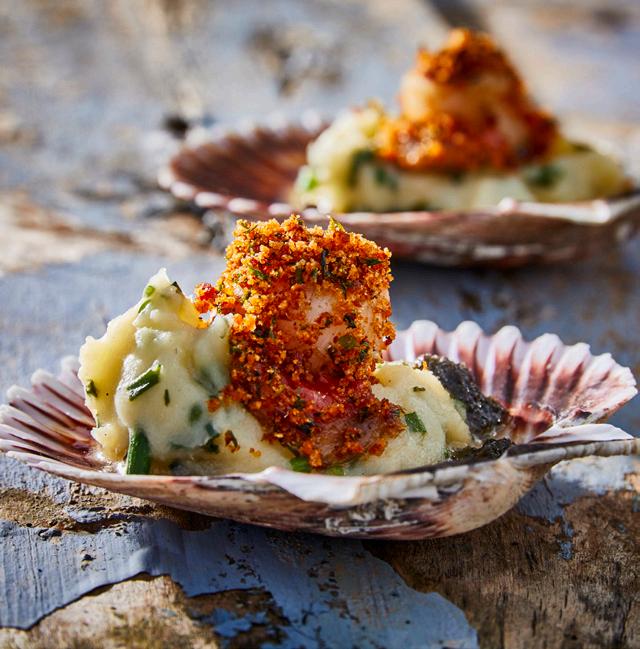 Heat the mashed potato with the bisque. Mix in the almonds and finely chopped herbs.