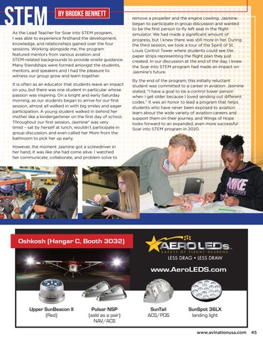 remove a propeller and the engine cowling. Jasmine began to participate in group discussion and wanted to be the first person to fly left seat in the flight simulator. We had made a significant amount of progress, but I knew there was still more in her. During the third session, we took a tour of the Spirit of St. Louis Control Tower where students could see the paper strips representing the flight plan they just created. In our discussion at the end of the day, I knew the Soar into STEM program had made an impact on Jasmine’s future. By the end of the program, this initially reluctant student was committed to a career in aviation. Jasmine stated, “I have a goal to be a control tower person when I get older because I loved sending out different codes.” It was an honor to lead a program that helps students who have never been exposed to aviation learn about the wide variety of aviation careers and support them on their journey, and Wings of Hope looks forward to an expanded, even more successful Soar into STEM program in 2020.