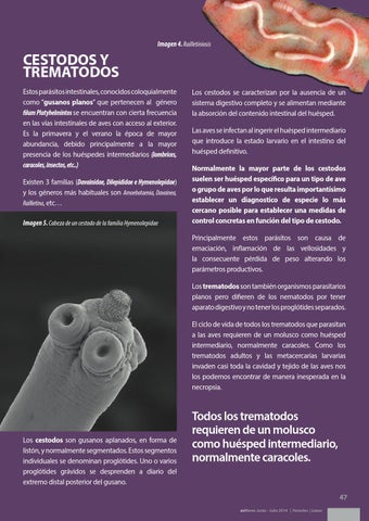 Todos los trematodos requieren de un molusco como huésped intermediario, normalmente caracoles. 47 aviNews Junio - Julio 2014 | Parasitos | Lizaso