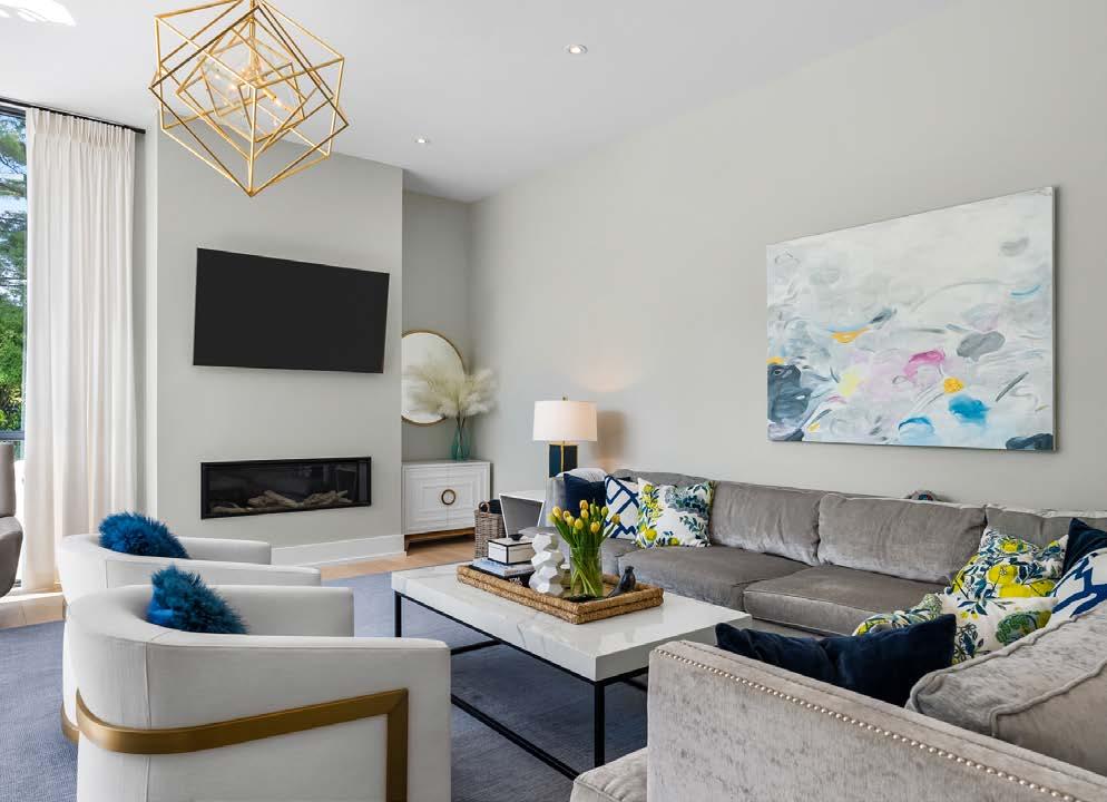 • Family room with custom built-ins (2020), gas fireplace, and floor-toceiling windows