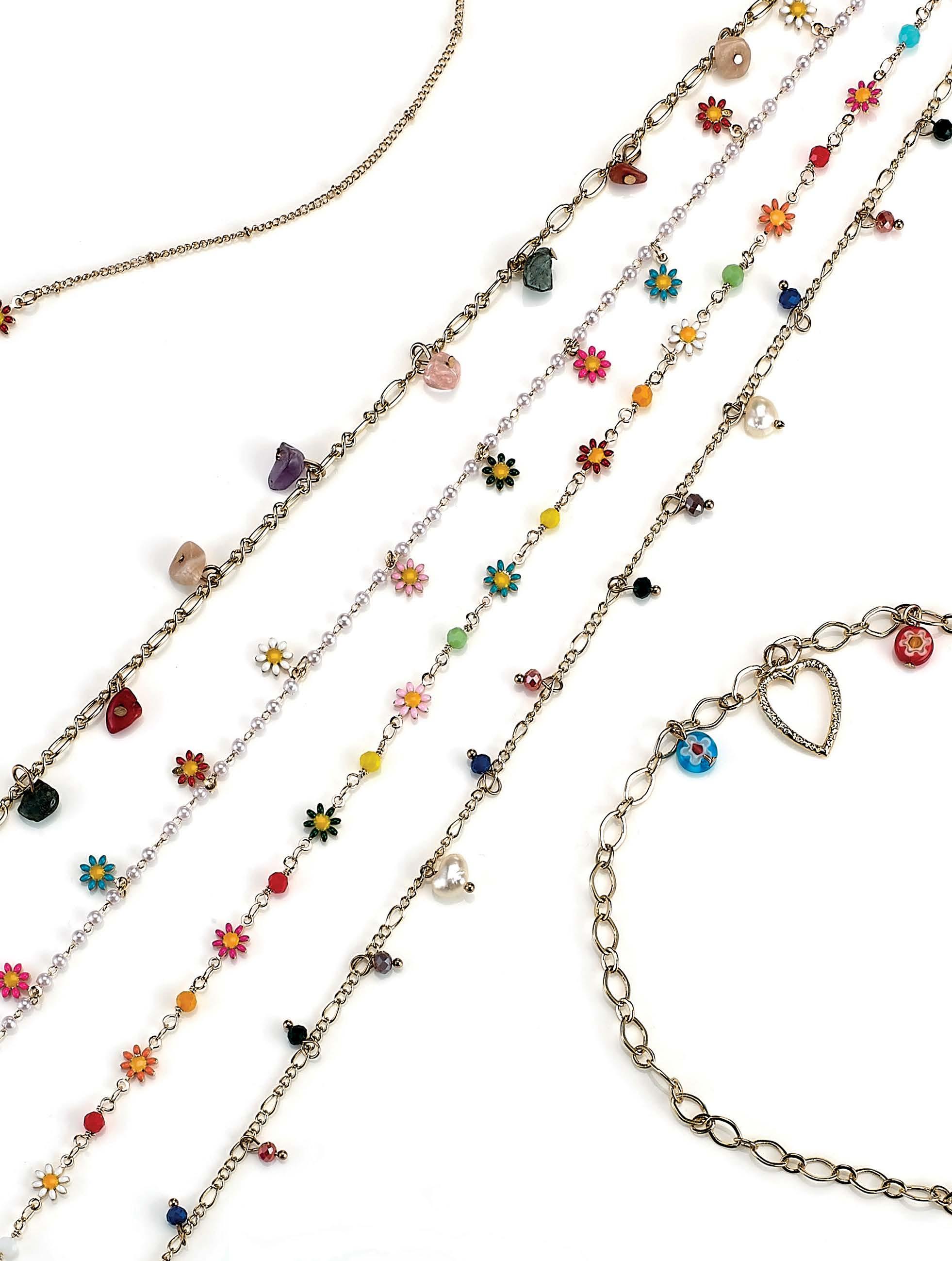 Super lightweight fabric chains with woven links. Comfortable on the skin and featured in fresh colours.