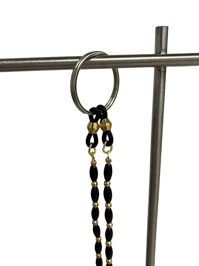 Most spectacle chains feature two lobster clasps. These glasps hold onto one end of the silicone chain end, will the other loop slides onto the back of the temples.