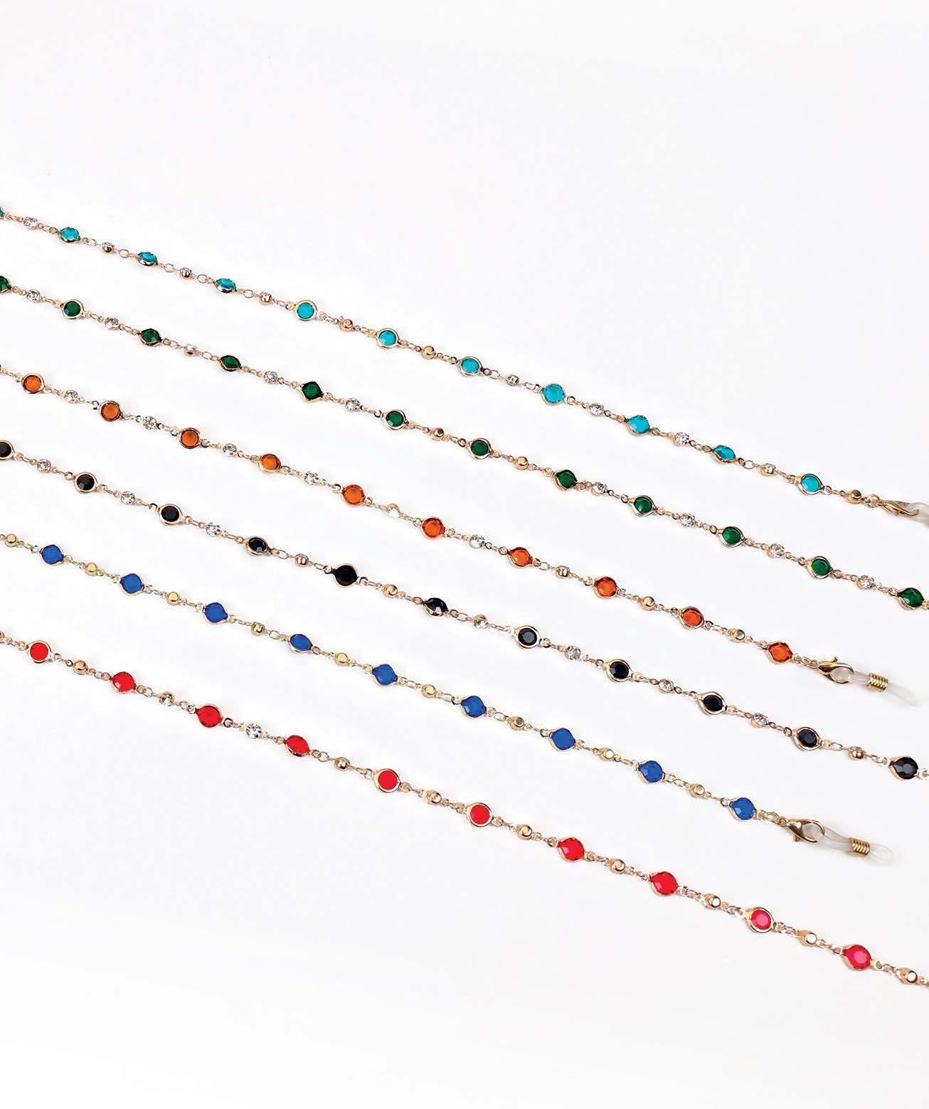 Metallic spectacle chains with decorative ceramic elements in the shape of hearts and crystals.
