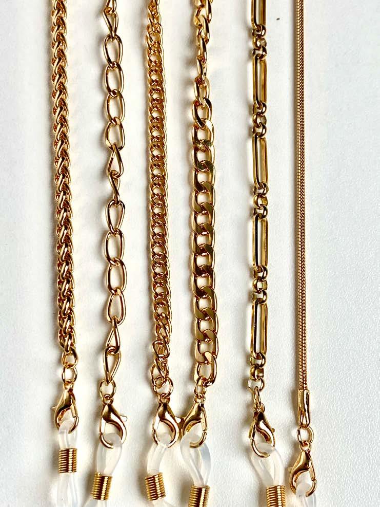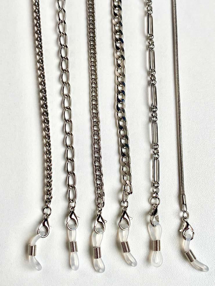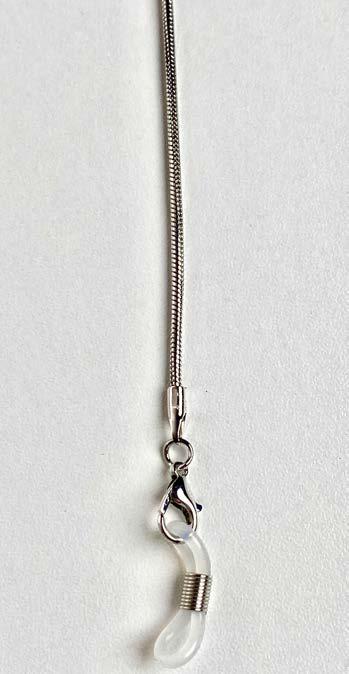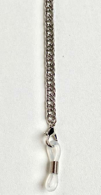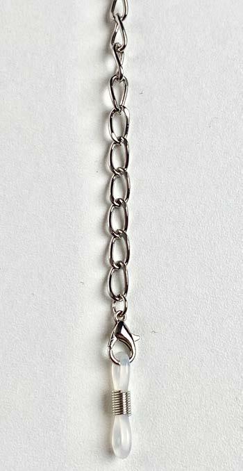 Most spectacle chains feature two lobster clasps. These glasps hold onto one end of the silicone chain end, will the other loop slides onto the back of the temples.