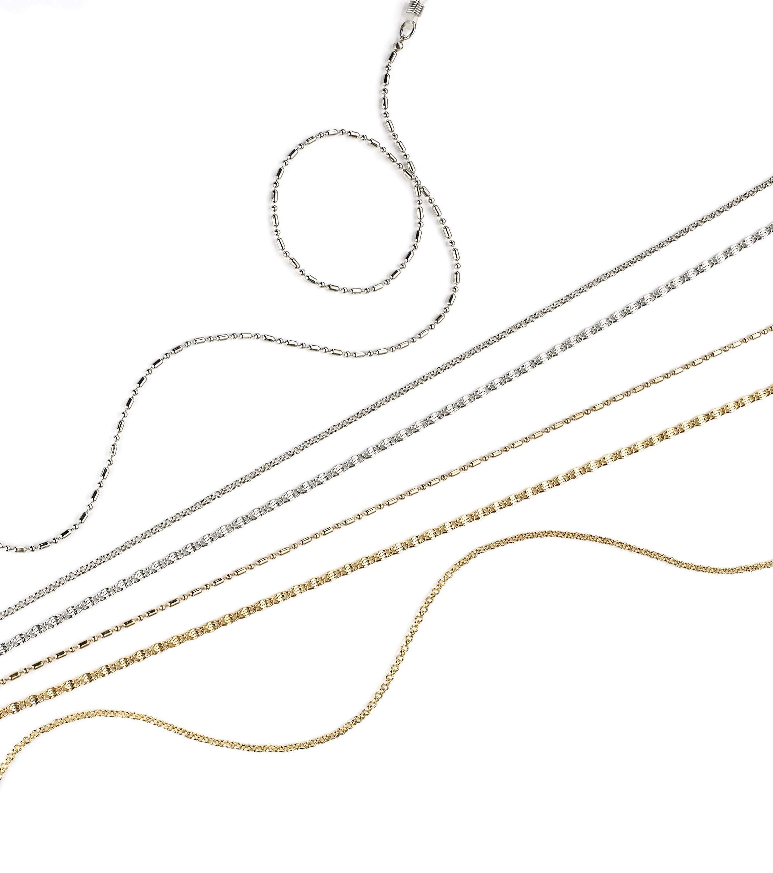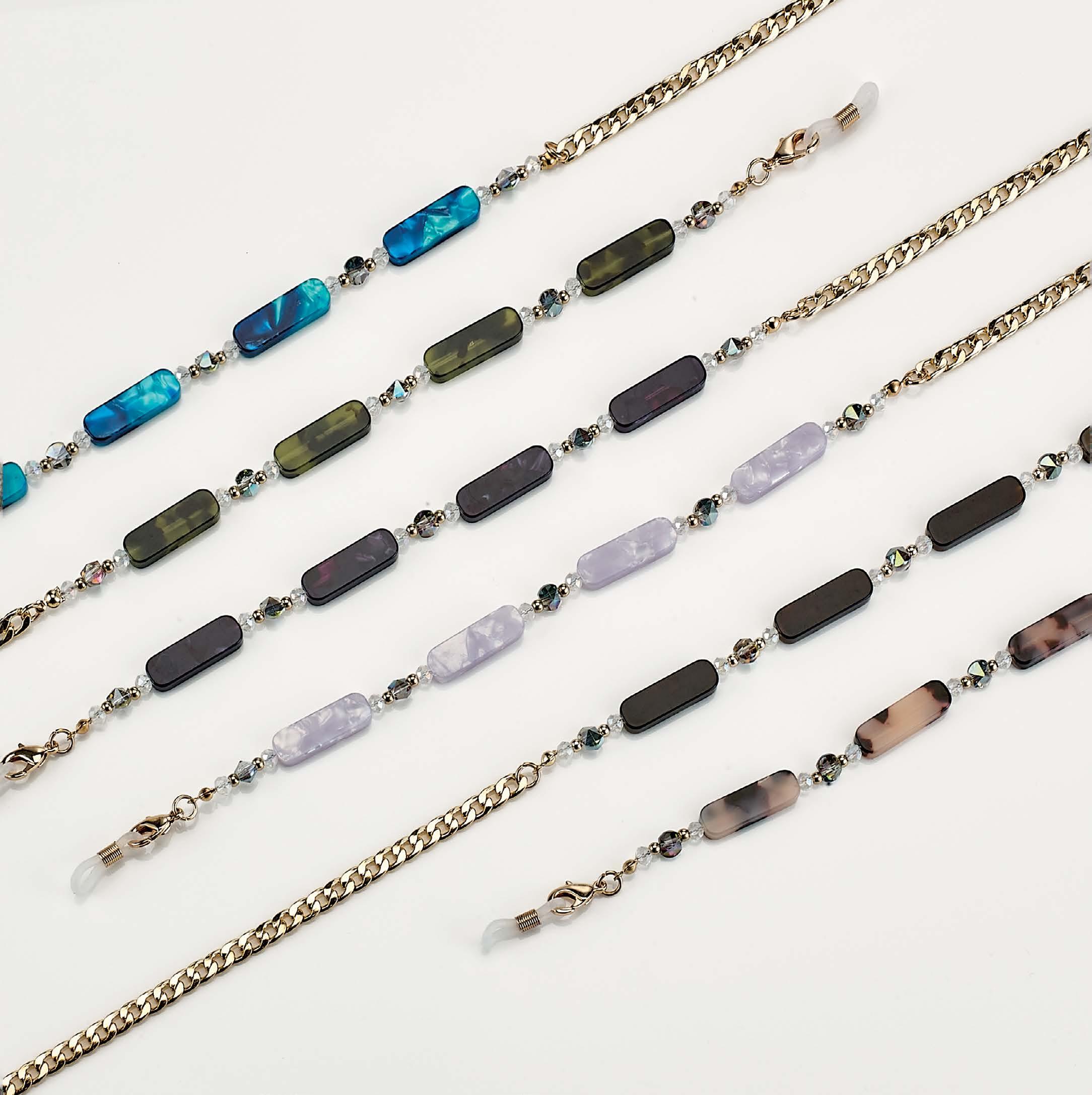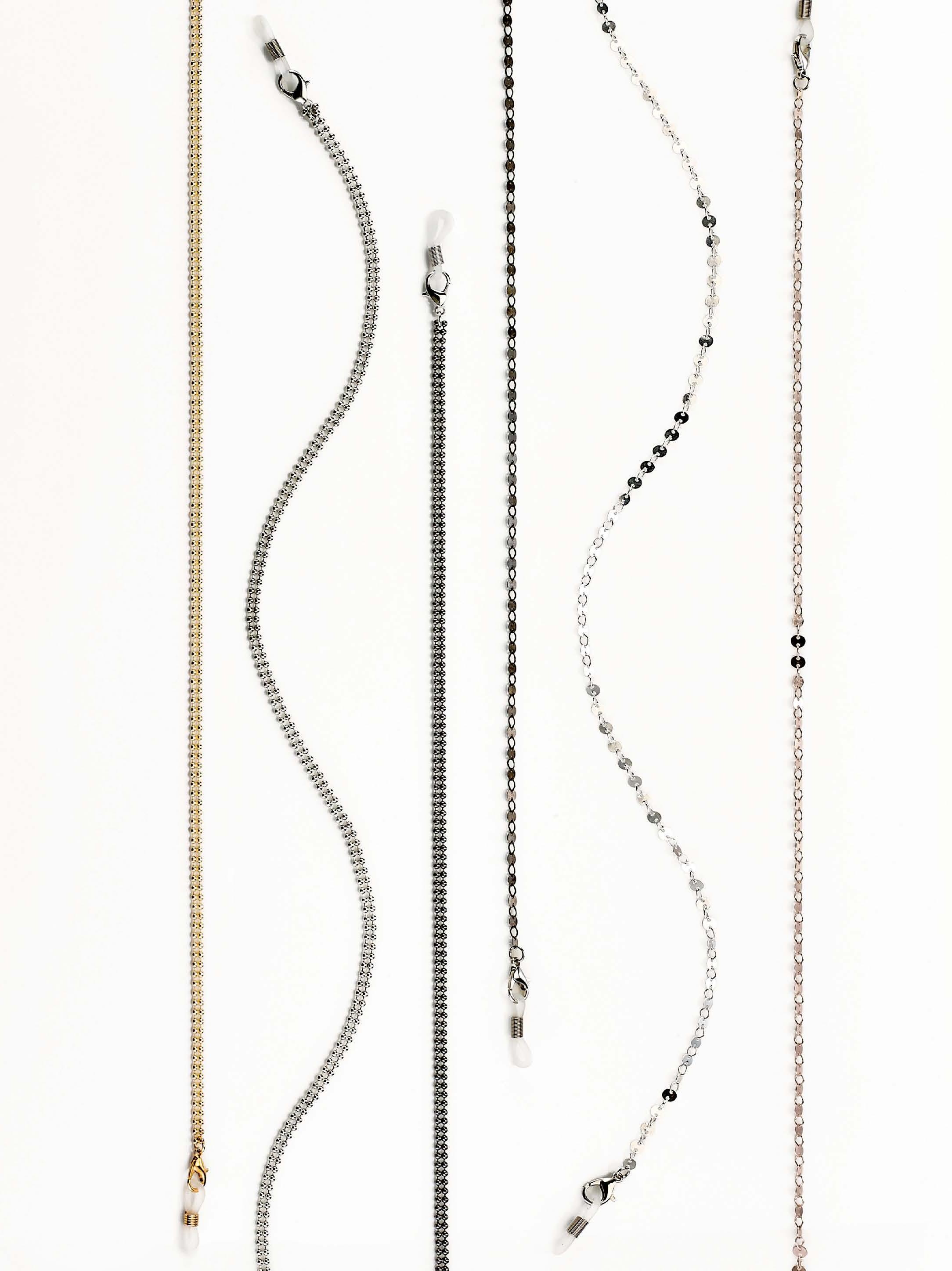 Metallic spectacle chains with decorative ceramic elements in the shape of hearts and crystals.