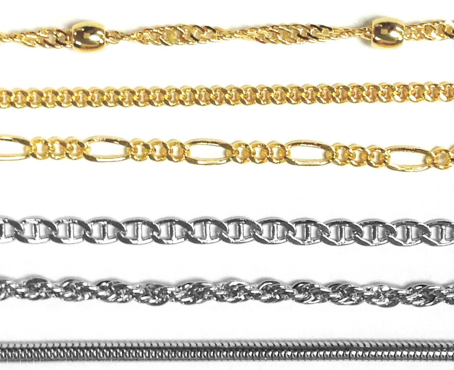 Gold and Silver Chains in a variety of chain links. Each chain has a lobster clasp with a silicone loop end. Sold individually or in mixed link packs of 12 pieces (Gold, Silver or Mixed)