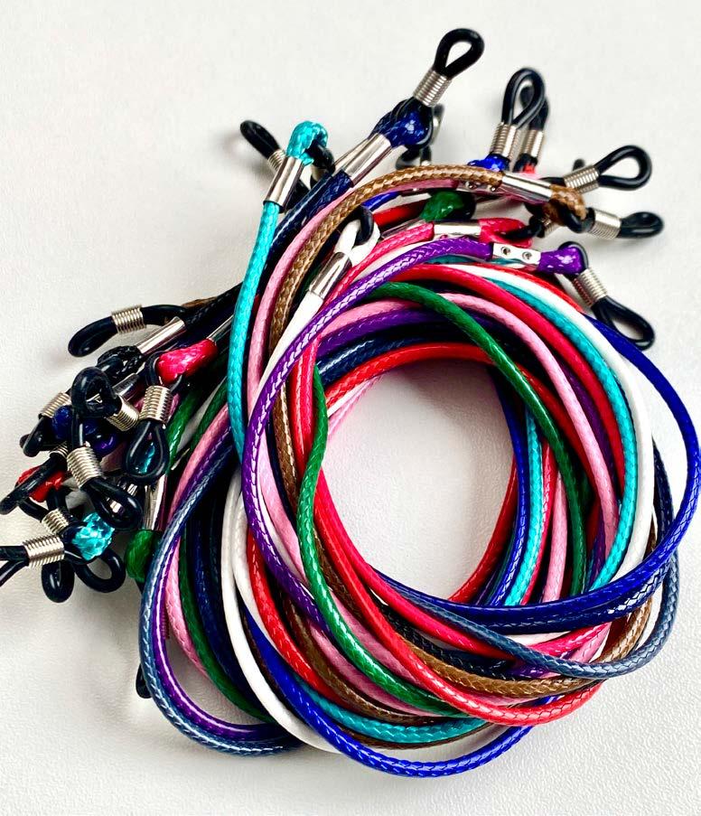 Colourful cotton spectacle cords for children. Each cord features a firm plastic sliding adjustor.