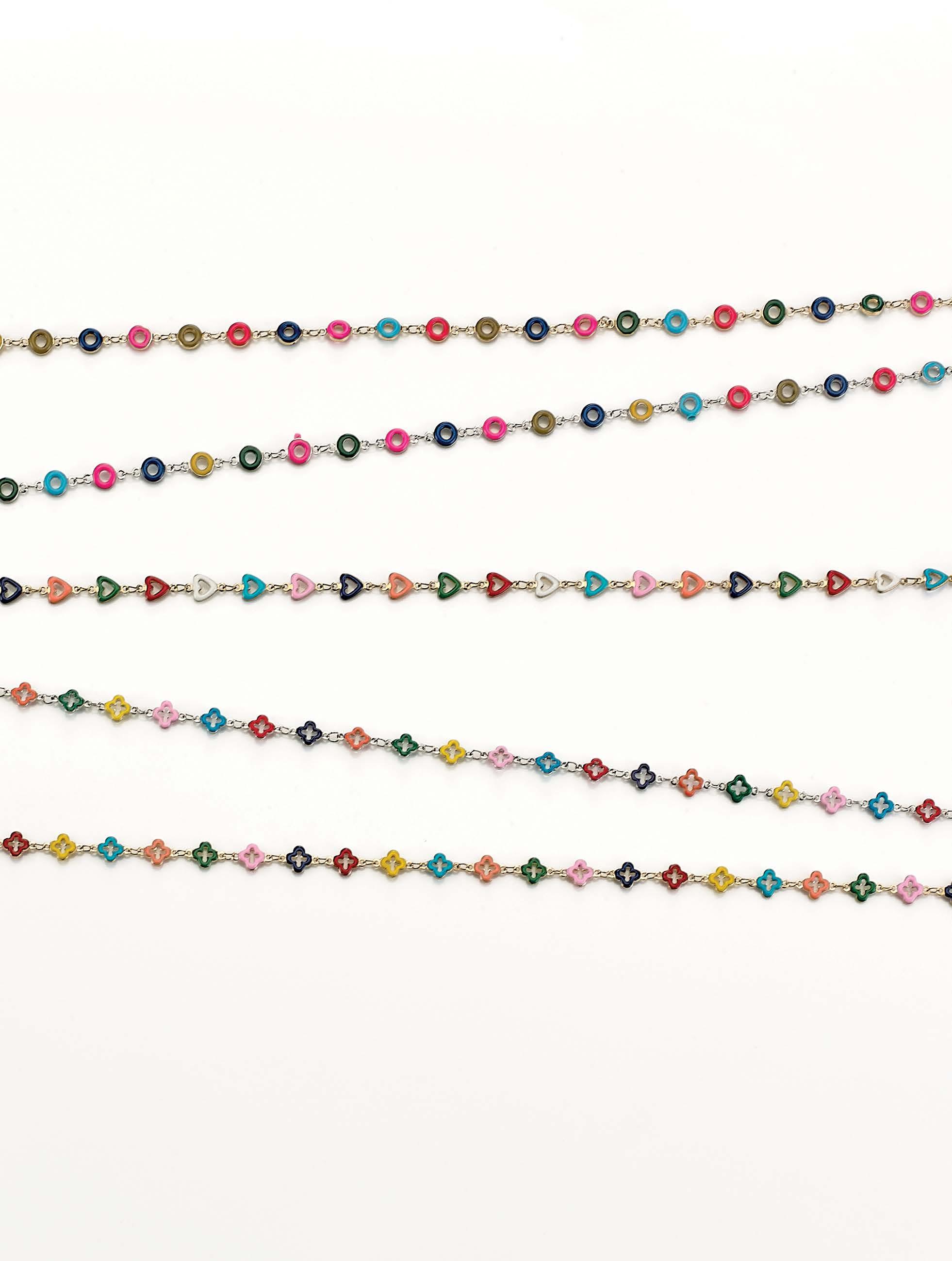 6 metal chains with lacquered decorations in various colours. Three different decorations (hearts, four-leaf clovers, and circles) are available on the gold and silver versions. Supplied with a practical display tray and a microfibre cloth.