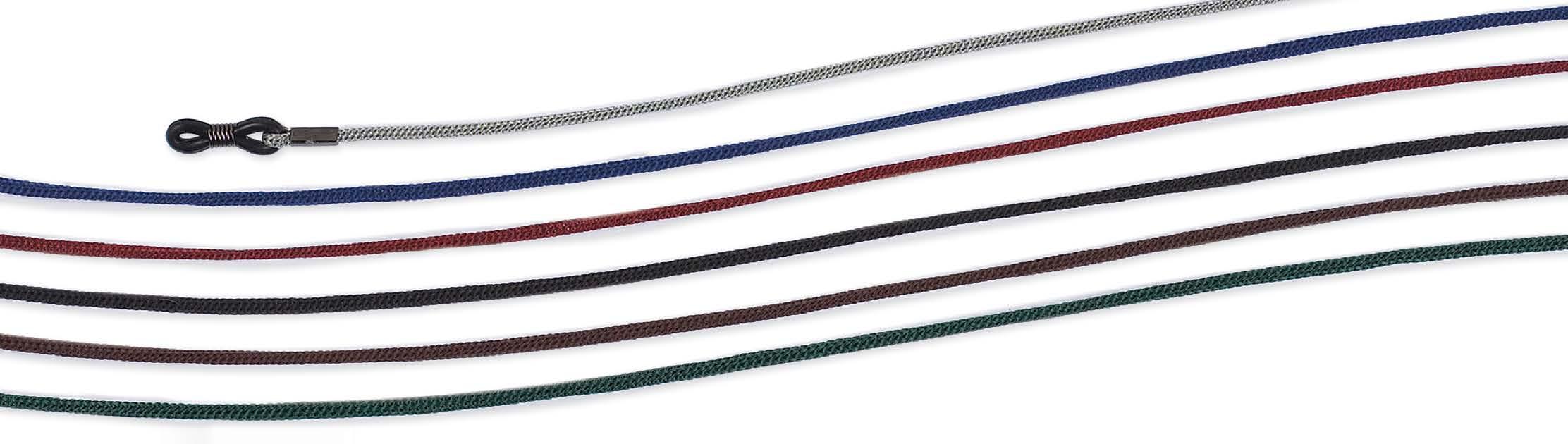 Cotton spectacle cords in neutral colours with gun metal finishes. Supplied assorted in Grey, Navy, Burgundy, Black, Brown, & Green