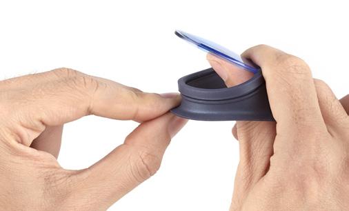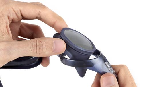 Follow steps in picture 1 through 5 below. Insert a rubber seal (O-ring included in the package) in the frame groove from the front. The Rx lens is then pushed into the swimming goggles from the front. It is important for the rubber seal (O-ring) be properly applied to the inner edge of the frame. The rubber seal must completely disappear behind the lens after insertion. If necessary, push the lens forward out of the frame again and readjust the rubber seal. In case a small portion of the O-ring is dislocated after the lens is plugged in, apply a little force on the lens in the outward direction and use your finger nail to squeeze in the O-ring (picture 6).