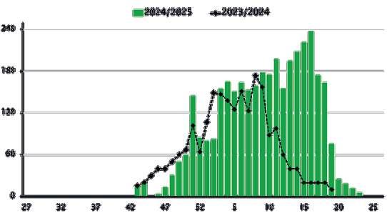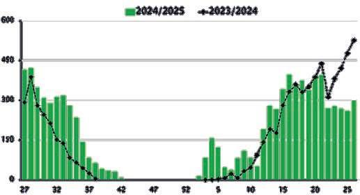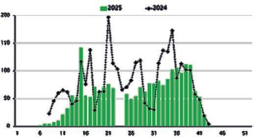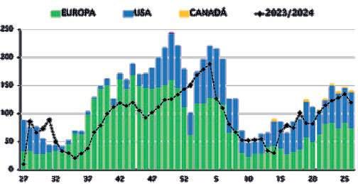 Data from Avobook confirm that Peru has been reducing its shipments in recent weeks. The peak was recorded in week 26, with about 860 containers arriving in Europe. Still, 2025 has exceeded the volumes exported in 2024, creating a stronger supply cushion in the first part of the campaign.