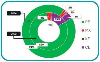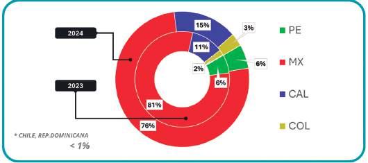 En estos gráficos, se presentan los principales países productores de aguacate Hass, según los volúmenes que exportan mensualmente durante el año. México, Perú, Colombia y Chile son los países que participan mayormente en los diferentes mercados. Se pueden ver los mercados que cada país abastece y los volúmenes comparativos de 2024 versus 2023. Esto nos permite entender la dinámica de la producción y exportación de aguacate Hass en cada país.