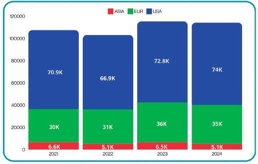 En estos gráficos, se muestran los mercados más consolidados para el aguacate Hass, como USA y Europa, que siguen creciendo en volumen cada año. También se presentan mercados en crecimiento, como Japón, Chile, Canadá, China y Korea. Se pueden ver los participantes de los diferentes orígenes en cada mercado, la evolución de precios y los comparativos de volúmenes totales de cada año. Esto nos permite entender la dinámica de la demanda y el comercio de aguacate Hass en cada mercado.