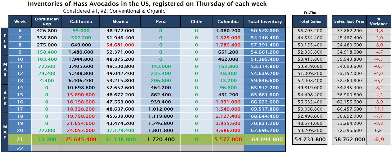 : USA Legend Green For numbers below the 25th percentile in the country's dataset of 2023 Red Blue For numbers above the 75th percentile in the country's dataset of 2023 Volume projections Arrival Week California Mexico Perú Chile Colombia Dom Rep Total Estimated Volume (Lb) Source: Hass Avocado Board 36 1.816.711 37.307.358 8.330.292 0 510.000 170.000 48.134.361 37 1.000.047 44.460.178 6.895.394 0 930.000 0 53.285.619 38 191.707 55.777.603 3.973.193 660.000 270.000 0 60.872.503 39 3.700 55.579.772 1.726.976 1.000.374 190.000 260.000 58.760.822 40 0 43.333.731 337.272 50.000 40.000 0 43.761.003 41 0 36.100.039 87.812 1.910.000 0 310.000 38.407.851 42 0 56.946.420 0 692.919 0 0 57.639.339 43 0 62.867.867 0 1.016.875 0 40.000 63.924.742 44 0 51.114.949 0 540.822 50.000 0 51.705.771 45 0 49.304.117 0 410.977 50.000 0 49.765.094 46 0 45.090.749 0 410.068 100.000 0 45.600.817 47 0 42.295.209 0 450.000 0 0 42.745.209 48 0 60.206.085 0 450.000 0 0 60.656.085 49 0 51.646.134 0 188.166 130.000 0 51.964.300 50 0 50.141.703 0 46.191 40.000 0 50.227.894 51 0 57.352.373 0 92.382 210.000 0 57.654.755 52 0 45.275.497 0 150.000 110.000 0 45.535.497 1 0 55.151.272 0 150.000 590.000 255.000 56.146.272 2 0 65.891.883 0 100.000 693.498 263.000 66.948.381 3 23.551 64.305.412 0 50.000 476.477 396.000 65.251.440 4 59.745 59.147.417 0 0 1.165.068 297.000 60.669.230 5 156.540 58.757.326 0 0 1.217.781 308.000 60.439.647 6 262.425 47.225.234 0 0 249.454 264.000 48.001.113 7 907.338 58.666.258 0 0 2.036.513 167.000 61.777.109 8 289.131 59.144.513 0 0 716.516 132.000 60.282.160 9 1.327.020 51.852.020 0 0 346.200 87.000 53.612.240 10 1.859.143 59.488.565 50.000 0 52.594 40.000 61.490.302 11 3.776.984 64.684.732 0 0 0 40.000 68.501.716 12 5.685.112 59.186.350 140.000 0 0 80.000 65.091.462 13 7.663.572 46.855.004 142.735 0 108.026 0 54.769.337 14 7.086.912 55.770.978 238.063 0 462.035 0 63.557.988 15 11.245.154 51.010.606 331.857 0 194.007 0 62.781.624 16 13.312.927 54.195.460 616.306 0 2.037.068 0 70.161.761 17 14.365.526 52.276.516 610.553 0 2.425.082 0 69.677.677 18 13.238.426 40.051.151 932.819 0 2.134.072 0 56.356.468 19 14.048.666 40.017.800 1.426.687 0 3.492.118 0 58.985.271 20 15.494.565 33.398.482 2.468.981 0 2.522.085 0 53.884.113 21 17.535.877 32.486.978 1.742.352 0 2.240.000 0 54.005.207 22 15.250.000 36.000.000 4.250.000 0 2.250.000 0 57.750.000 23 15.250.000 36.750.000 6.000.000 0 2.500.000 0 60.500.000 24 15.250.000 36.250.000 7.500.000 0 2.500.000 0 61.500.000 25 15.750.000 34.000.000 9.000.000 0 2.750.000 0 61.500.000 26 10.500.000 31.250.000 12.250.000 0 2.750.000 0 56.750.000 27 9.000.000 29.500.000 16.000.000 0 3.150.000 0 57.650.000 28 10.250.000 31.500.000 16.250.000 0 3.000.000 0 61.000.000 29 9.000.000 29.000.000 17.500.000 0 2.500.000 0 58.000.000 30 8.750.000 27.500.000 18.000.000 0 2.500.000 0 56.750.000 31 5.000.000 29.000.000 17.750.000 0 2.250.000 0 54.000.000 32 5.000.000 36.000.000 17.500.000 0 1.900.000 0 60.400.000 33 4.500.000 34.750.000 16.500.000 0 1.500.000 0 57.250.000 34 3.750.000 34.000.000 13.000.000 0 1.000.000 0 51.750.000 J U N J U L A U G N O V S E P O C T M A R A P R M A Y D E C J A N F E B Arrival Week California Mexico Perú Chile Colombia Dom Rep Total Estimated Volume (Lb)