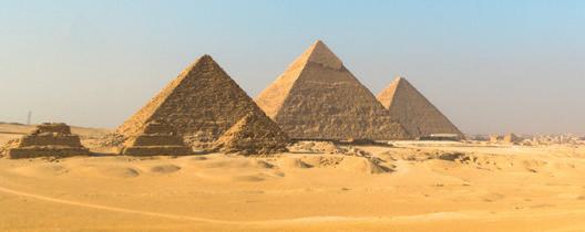 Consideradas una de las Siete Maravillas del Mundo Antiguo, y declaradas oficiosamente la octava del Mundo Moderno, las pirámides de Keops, Kefrén y Micerinos se encuentran unos 20 kilómetros al sur de El Cairo y forman parte de la Necrópolis de Guiza, junto a la Gran Esfinge y otros templos y pirámides de gran antigüedad y aún mayor relevancia histórica.