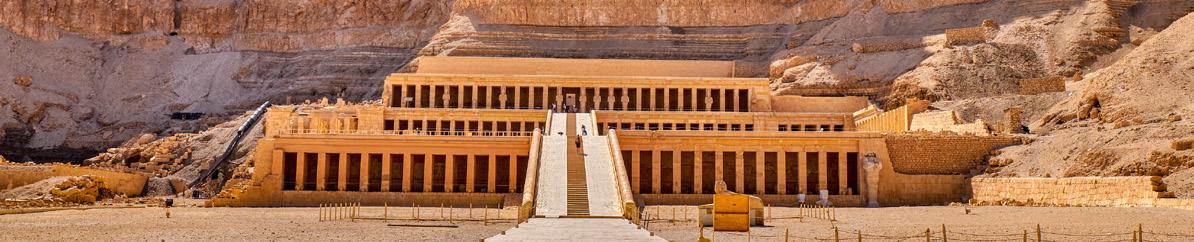 Hatchepsut (la única faraona del Antiguo Egipto) y los Colosos de Memnón. Parece que la naturaleza hubiera construido este extraordinario monumento al encontrarse situado sobre unas terrazas y rodeado de escarpados acantilados de piedra caliza.