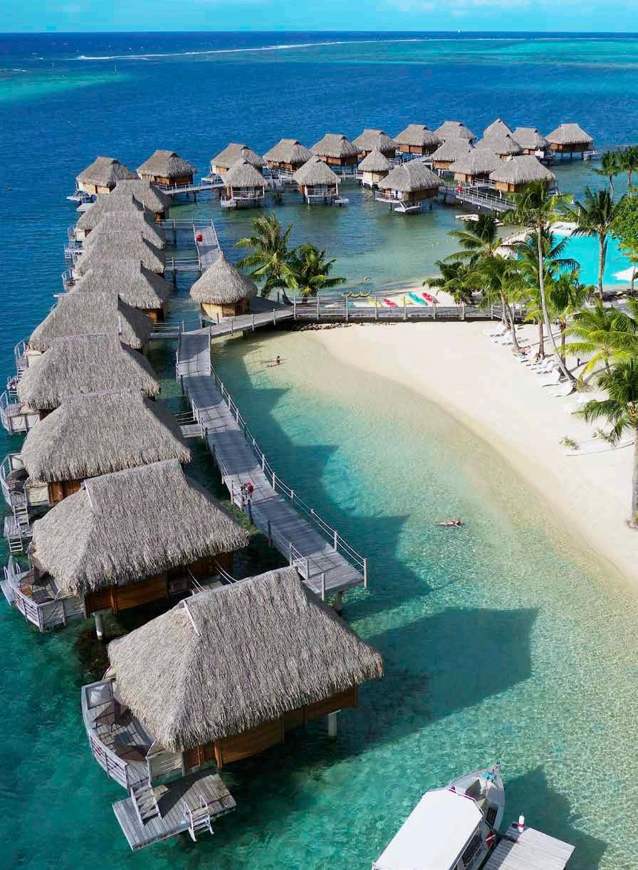 • Overwater: un tipo de alojamiento que se suele encontrar en Polinesia y Maldivas, son bungalows que están completamente sobre el agua, se suele llegar a ellos por una pasarela de madera desde la playa y, en ocasiones, disponen de una pequeña barca para desplazarse.