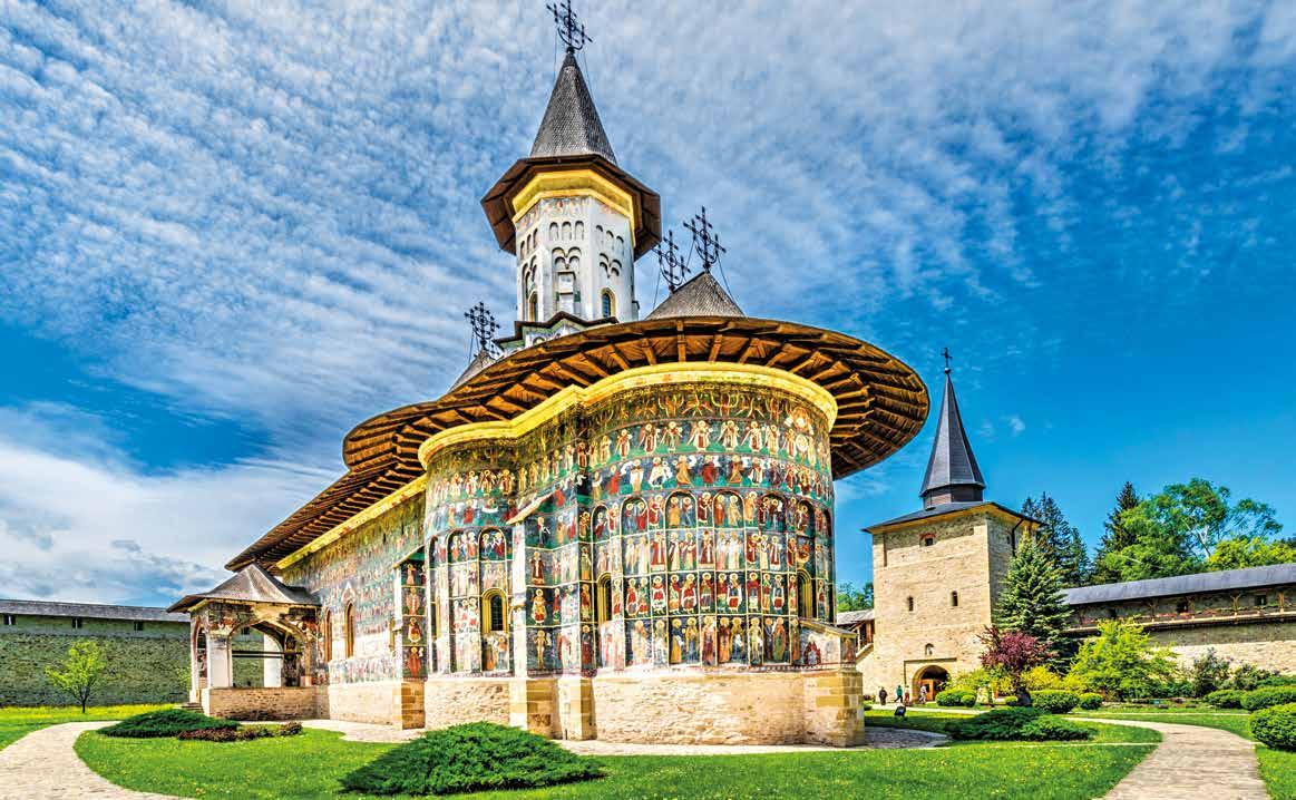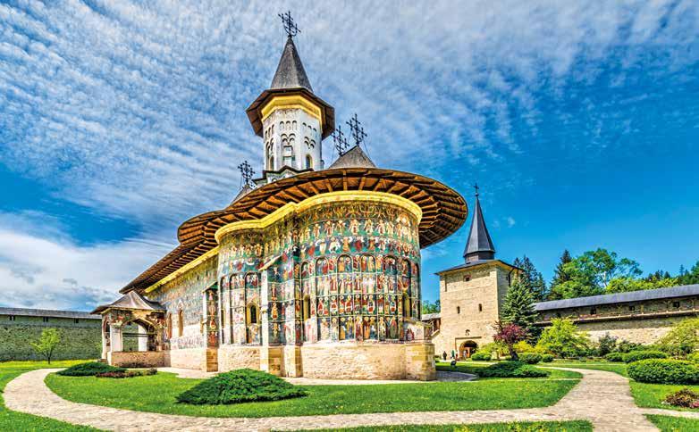 siglos XV y XVI, que constituyen la principal atracción de la zona, por los frescos de vivos colores que decoran tanto el interior como el exterior de los templos y reconocidos como Patrimonio de la Humanidad por la Unesco. Comenzaremos visitando el monasterio de Moldovita, rodeado de fortalezas y con frescos externos. Los frescos externos fueron empleados para obtener el máximo realismo en las escenas de vida cotidiana, humanizando a los personajes. Almuerzo en ruta. A continuación, visitaremos el monasterio de Sucevita, conocido por el importante fresco “La Escalera de la Virtudes” y su cinta mural. Salida hacia nuestro hotel en la región de Bucovina. Cena y alojamiento.