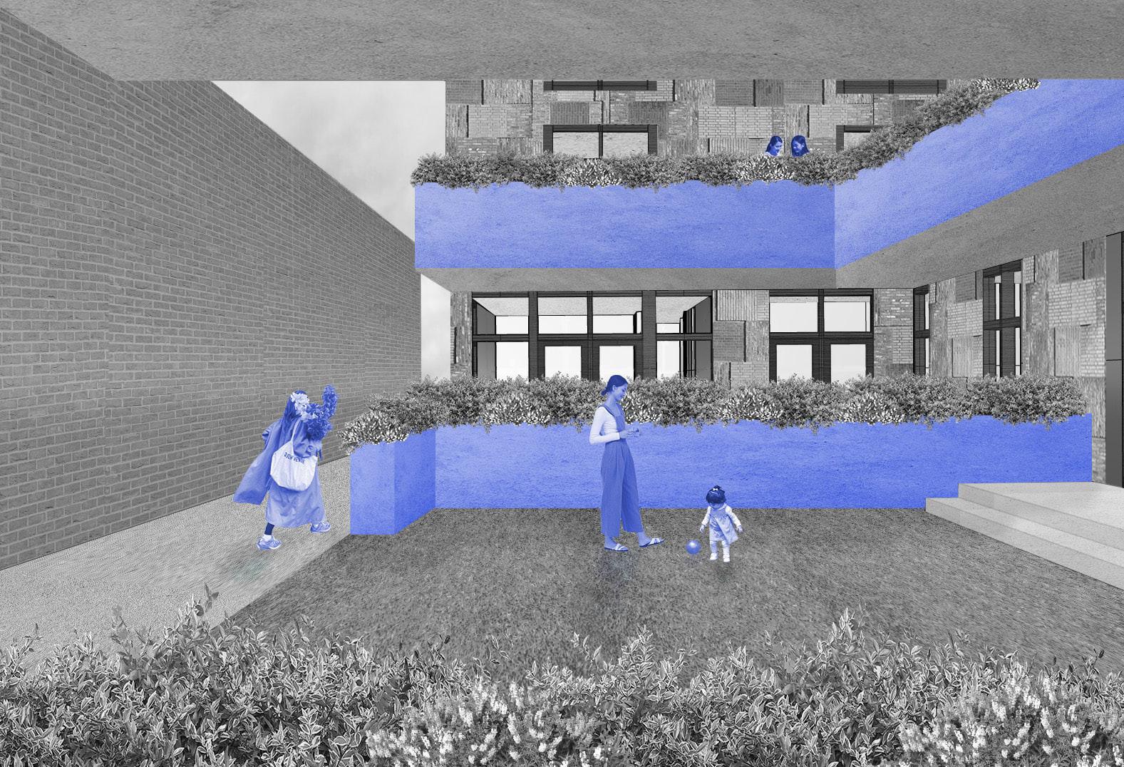 Re-Brick is situated in Cambridge, Ontario, between two buildings. The building’s brick is sourced from local abandoned buildings and upcycled to create a playful, welcoming exterior. The user groups are women and children, and refugees, both of whom have possibly faced negligence, abuse, discrimination and are suffering from trauma. Similarly to how the materials are given a new building to be a part of, the women and refugees are given a safe and supportive place to find their new life and build their families and careers.