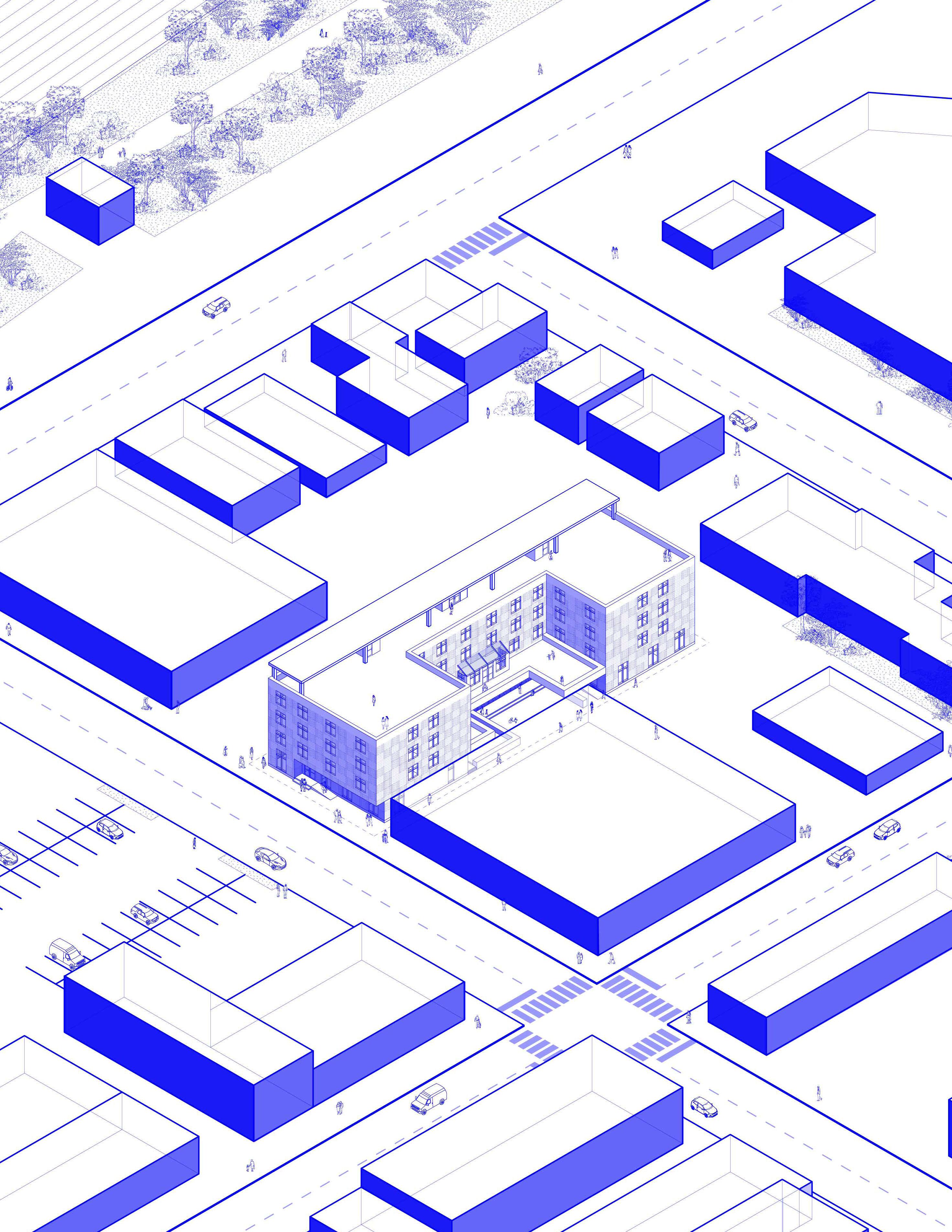 Safety and support were the guiding factors for this project. The resident should always feel safe in their home, and the design should encourage that idea. A major part of the design is the courtyard that opens towards the adjacent building rather than the road or driveway. The courtyard on the ground floor is then semi-private as it is accessible by the public. This can make some residents uncomfortable, the response was to create a resident’s balcony on the second floor, as well as further utilize the roof as a completely private resident space.