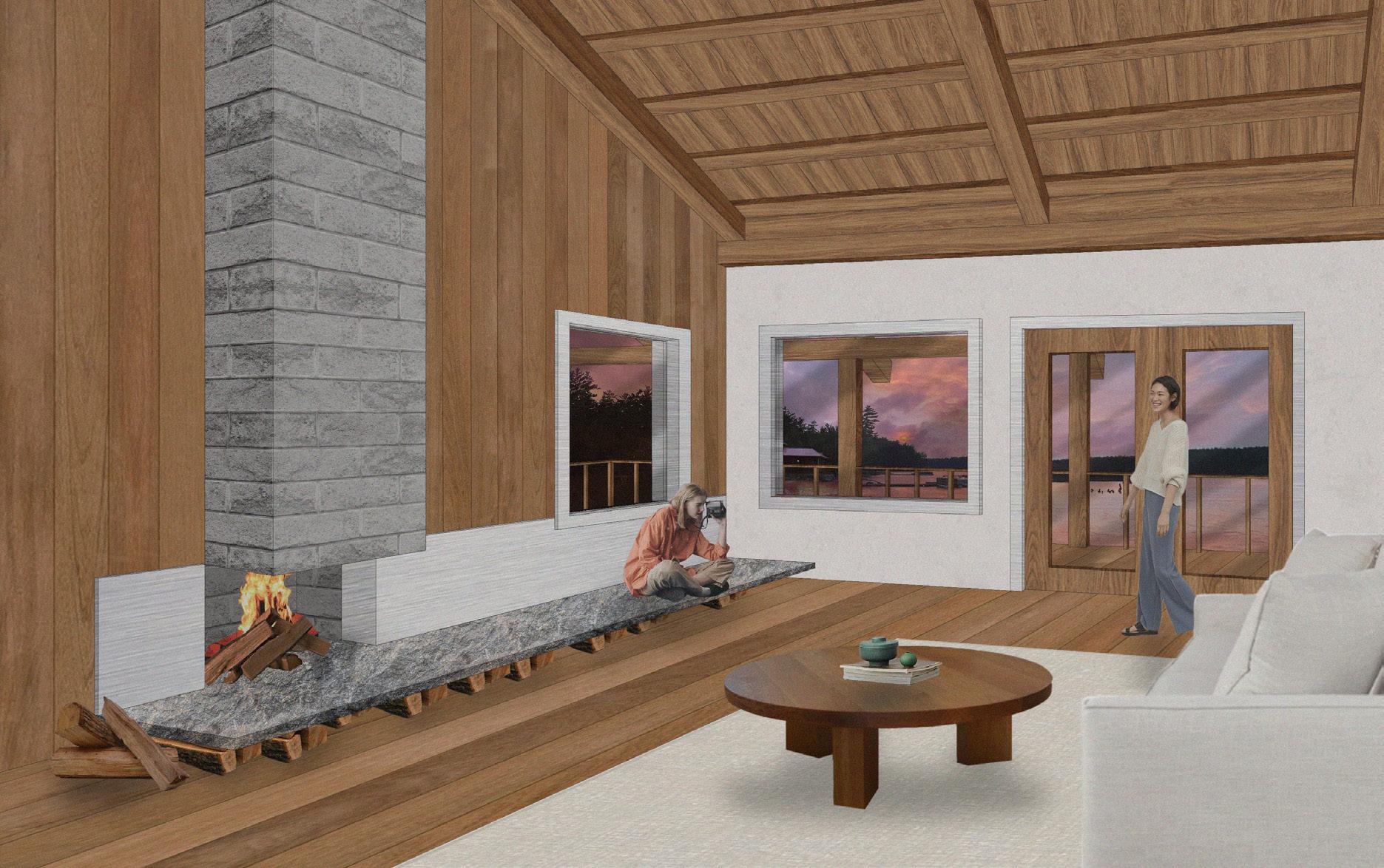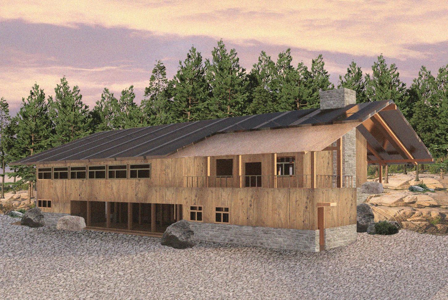 The building itself is partially embedded in the granite site, creating an opportunity for a set of interior stairs and a recessed shelf for the bar. The main floor has the heavier materials, transitioning the outdoor rock formations to a similar rough texture indoor. This is where meals are served and where there can be larger indoor gatherings. The second floor was designed to be a quieter more intimate space with wood finishes and a warm fireplace. The research lab is also located on the second floor, with the south side under the double-head space, looking out to the forest, and the north side looking out to the French River.