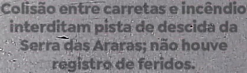 já acidentado. Com a batida, veículo que transportava combustível pegou fogo. Equipes da PRF foram acionadas e estiveram no local realizando o atendimento da ocorrência e a orientação dos motoristas. Devido ao risco e ao posicionamento dos veículos, a descida da serra precisou ser totalmente bloqueada. Por volta das 16h10min, para minimizar o congestionamento, foi implantada mão dupla na pista de subida, permitindo a passagem alternadadosveículosenquantoas equipestrabalhamnaremoçãodas carretas e na limpeza da via. Por volta de 19 horas, houve liberação total da pista.