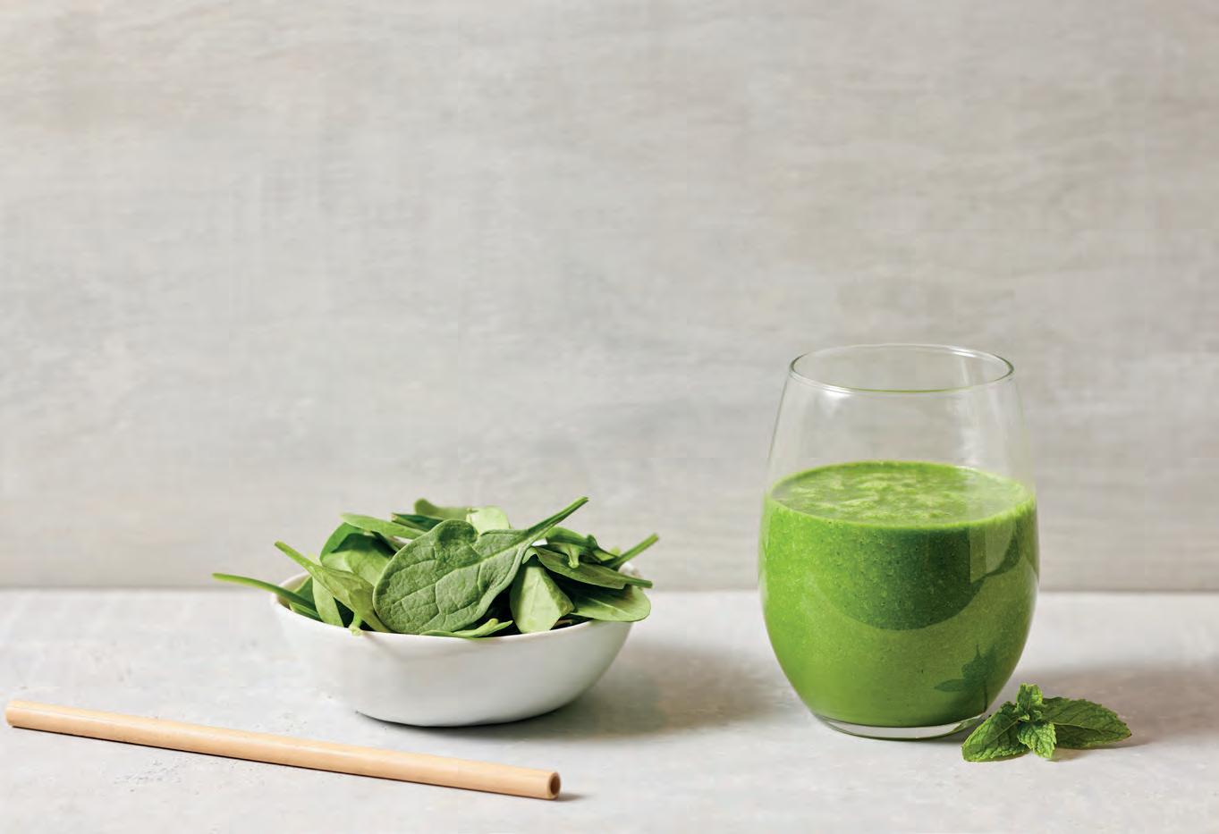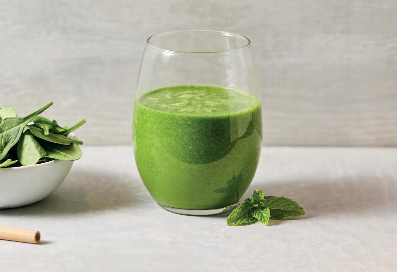 tasses de jeunes épinards • ½ banane mûre • 6 feuilles de menthe fraîche • 2 dattes, dénoyautées •