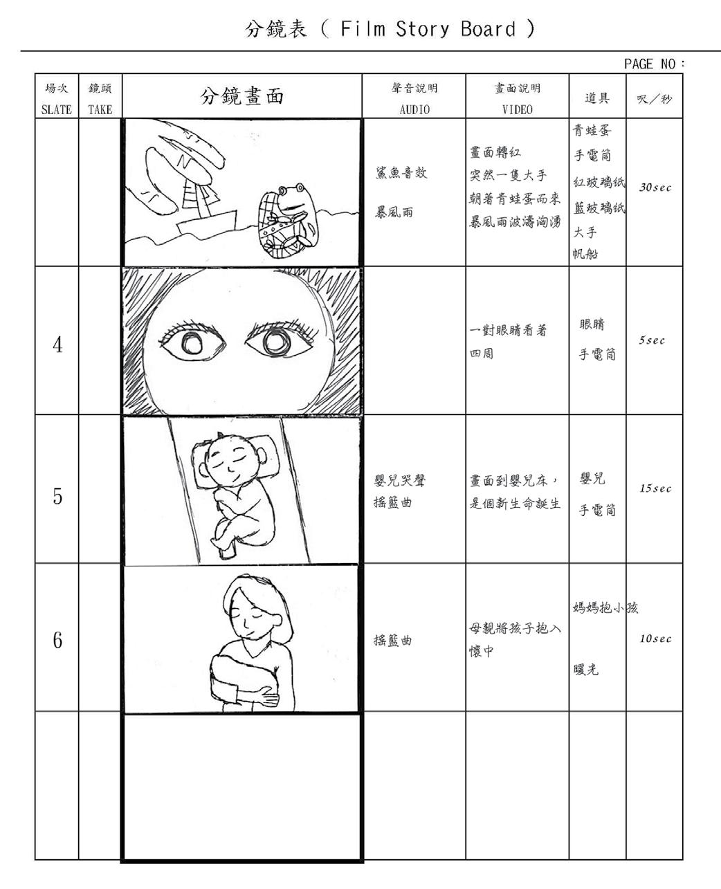 青蛙游呀游遇上了一顆蛋,聚緊地抱住他,慢慢浮上了海 水,原本平平淡淡地開始了屬於他的奇幻漂流,突然地,場 景亮起了警示燈,海水漲潮不穩定的暴風雨,就預警著有事情 即將發生了,下一秒,一隻大手湧入了畫面裡,抓住了他。 一對眼四周好奇地看著四周,意味著新生命的誕生,畫面轉到 要兒床,孩子哭著,母愛的力量 ,讓孩子漸漸地睡着了。