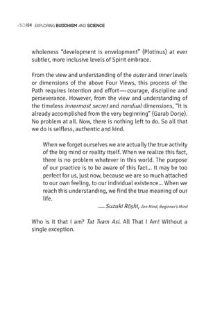 wholeness “development is envelopment” (Plotinus) at ever subtler, more inclusive levels of Spirit embrace. From the view and understanding of the outer and inner levels or dimensions of the above Four Views, this process of the Path requires intention and effort—courage, discipline and perseverance. However, from the view and understanding of the timeless innermost secret and nondual dimensions, “It is already accomplished from the very beginning” (Garab Dorje). No problem at all. Now, there is nothing left to do. So all that we do is selfless, authentic and kind. When we forget ourselves we are actually the true activity of the big mind or reality itself. When we realize this fact, there is no problem whatever in this world. The purpose of our practice is to be aware of this fact... It may be too perfect for us, just now, because we are so much attached to our own feeling, to our individual existence... When we reach this understanding, we find the true meaning of our life. —Suzuki R shi, Zen Mind, Beginner’s Mind Who is it that I am? Tat Tvam Asi. All That I Am! Without a single exception.