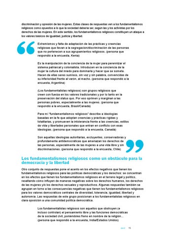 discriminación y opresión de las mujeres. Estas clases de respuestas ven a los fundamentalismos religiosos como opuestos a lo que la sociedad debería ser, según las y los activistas por los derechos de las mujeres. En este sentido, los fundamentalismos religiosos constituyen un ataque a los valores básicos de igualdad, justicia y libertad.