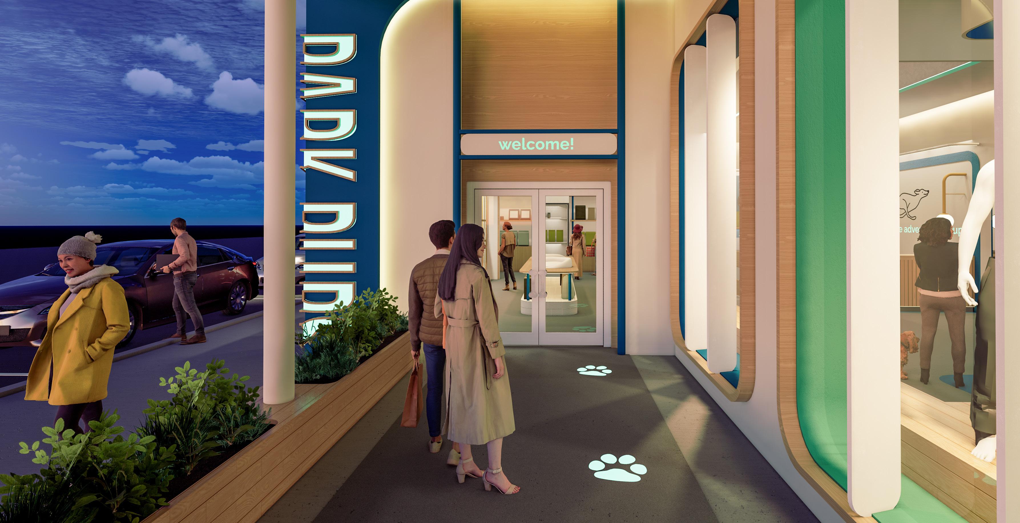 Much like how a dog park works, there is a "pre entry" space which is the general dog supplyretail that customers enter into. They are then guided to the large central "dog park" area wich has sightlines to the outdoors and into the doggie daycare. Onlookers can look into the store and see the primary space like how onlookers can see dogs playing in a park.