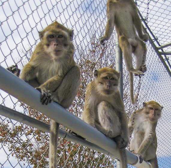 Hanu and Rocky (top) and Ganesh and Junior (bottom) enjoy life in the open air at Primates Incorporated.