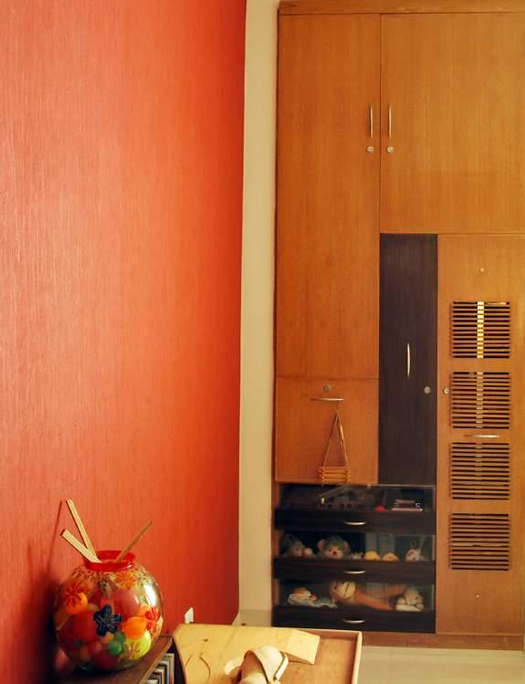 Adequate storage was provided for kitchen utensils and dry food. Black marble kitchen top and flat stove with a hood were installed. One exhaust fan and one wall fan was provided for proper ventilation. The kitchen cabinets were composed of orange and white laminated boards with black edging. Open rack with decoration pieces and crockery acted as a space devider between the kitchen and adjacent corridor. The floor was laid with square (12”x12”) local tiles which were less expensive compared to other imported tiles (87tk/sqft).