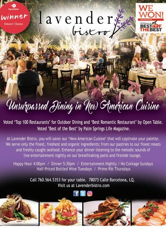 Page 39 Desert Charities News – www.desertcharities.com • www.dcnnews.com January/February/March 2023 “Inmybook,Fisherman’sMarket&Grillisahole-in-one!”-RachaelRay “TheFishTacohereistrulyextraordinary;truly,truly,extraordinary!”-AnthonyBourdain Delicious Seafood Kabob Medley, Fish ʻNʼ Chips and Fabulous Fish Tacos, Mouth-Watering Prime Steak ʻNʼ Fresh Lobster. FRESH DAILY, TWENTY-FIVE (25) YEARS STRONG! FROM THE OCEAN FLOOR TO OUR DOOR, LA QUINTA 78575 Highway 111 760-777-1601 PALM DESERT 44250 Town Center Way 760-776-6533 PALM SPRINGS 235 S. Indian Canyon Dr. 760-327-1766 FISHERMAN’S MARKET & GRILL DCN SPOTLIGHT DCN SPOTLIGHT