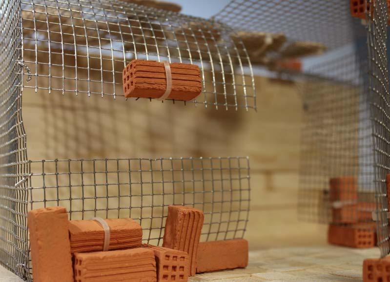 Starting from a balloting process, how can these three materials fit together to form a shed? After many iterations we landed on a curved form, deriving the curve from the weight of the brick and the natural deformation of the mesh. Floating bricks were meant to maintain the floating effect using clear zipties, as permenent connections between materials were not allowed.