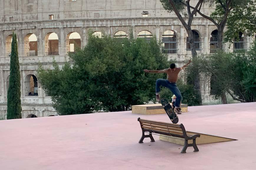 (Opposite) Rome, 2022. Backstage, athletes warm up at trials to represent Italy in the Olympics first street skating event.