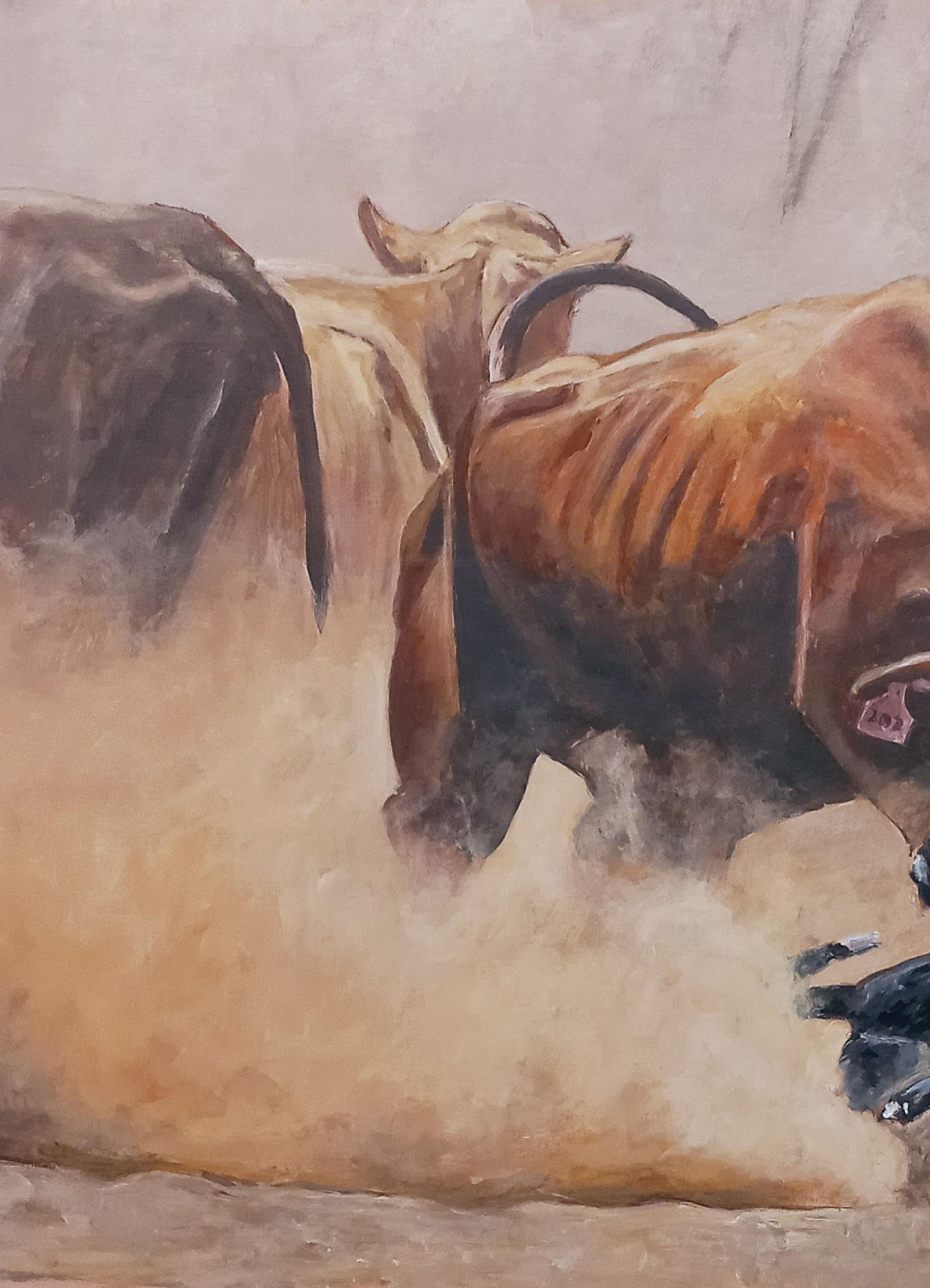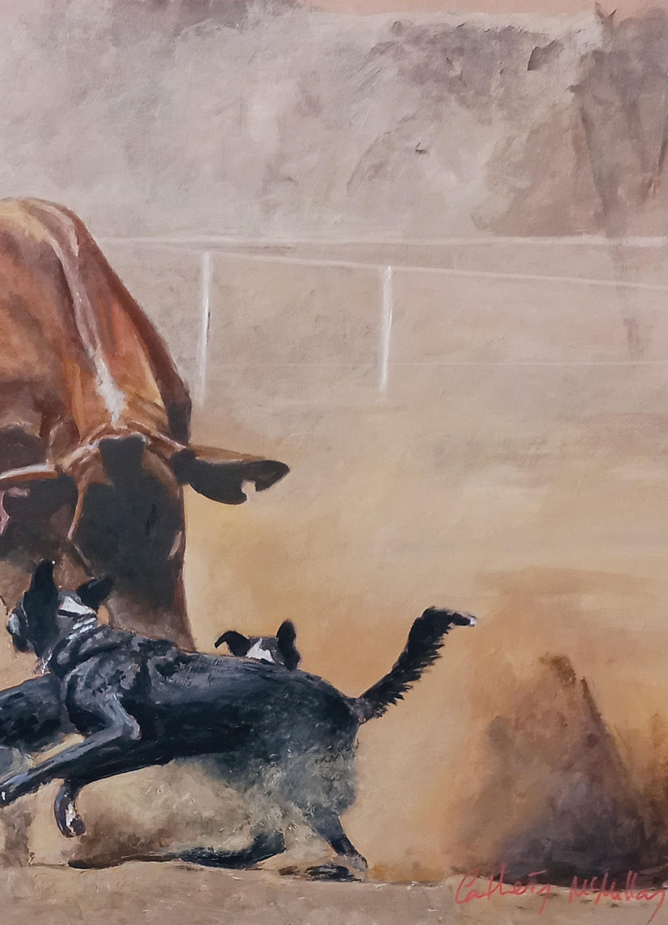 I am Catherin McMillan a portrait artist from the South Coast of NSW. Having grown up in a farming family and living in the middle of dairy farming country, I’m captivated by rural life. I love nothing more than depicting the people on the land be it at work or at leisure. Denim and dust are my passion. From dogs working bulls in a yard to stockmen and their dogs bringing a mob of cattle home at the end of the day. This is one of my paintings, ‘Stand Off’. You can view more of my work on my website www.animalarthouse.com. Open for commissions.