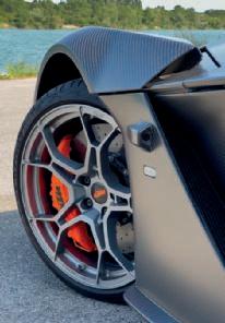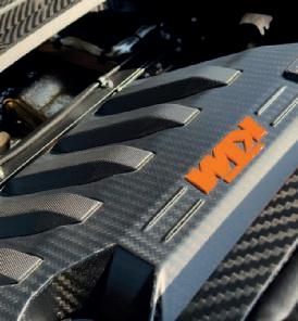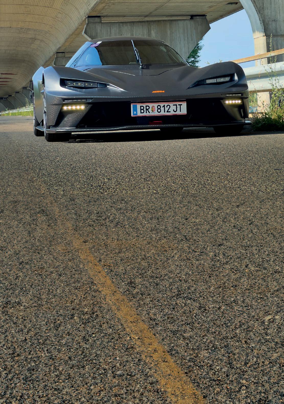 Es gibt da draußen viele Autos, die mit „Motorsport-Genen“ werben. Doch der GT-XR verschiebt nachhaltig und gravierend den Maßstab dafür, was diesbezüglich noch als legitim durchgeht. Geräuschdämmung? Pah! Infotainment? Ballast. Airbags? Pfff. Türen? Lieb. Das braucht der Über-StraßenKTM alles nicht. Stattdessen gibt es Karbon überall, eine Quad-LockHalterung fürs Smartphone, direkt ins Monocoque eingearbeitete Sitzschalen, eine Feuer spuckende Abgasanlage und die spektakulärste Art, ein Auto zu öffnen und zu schließen, die wir jemals gesehen haben.