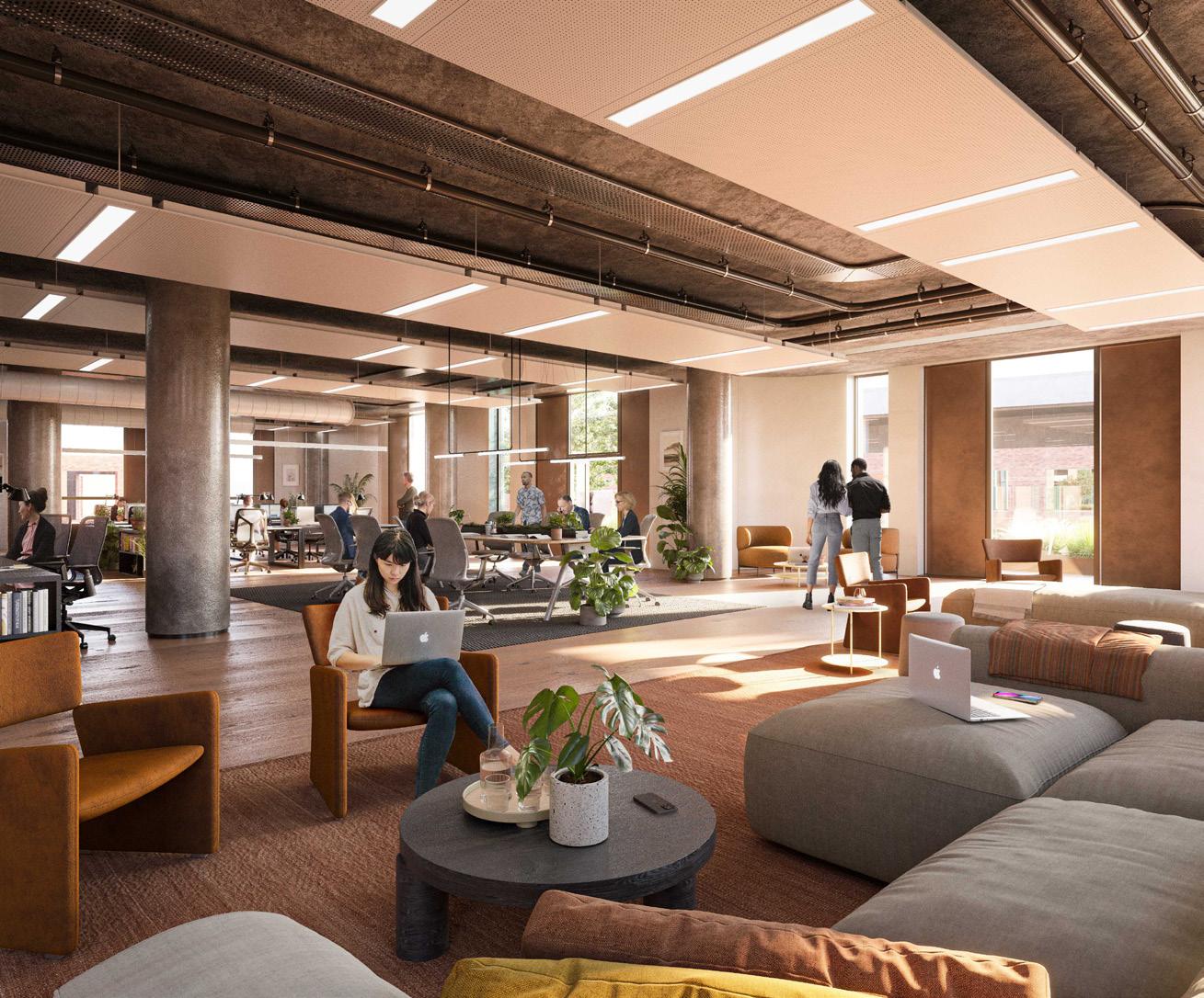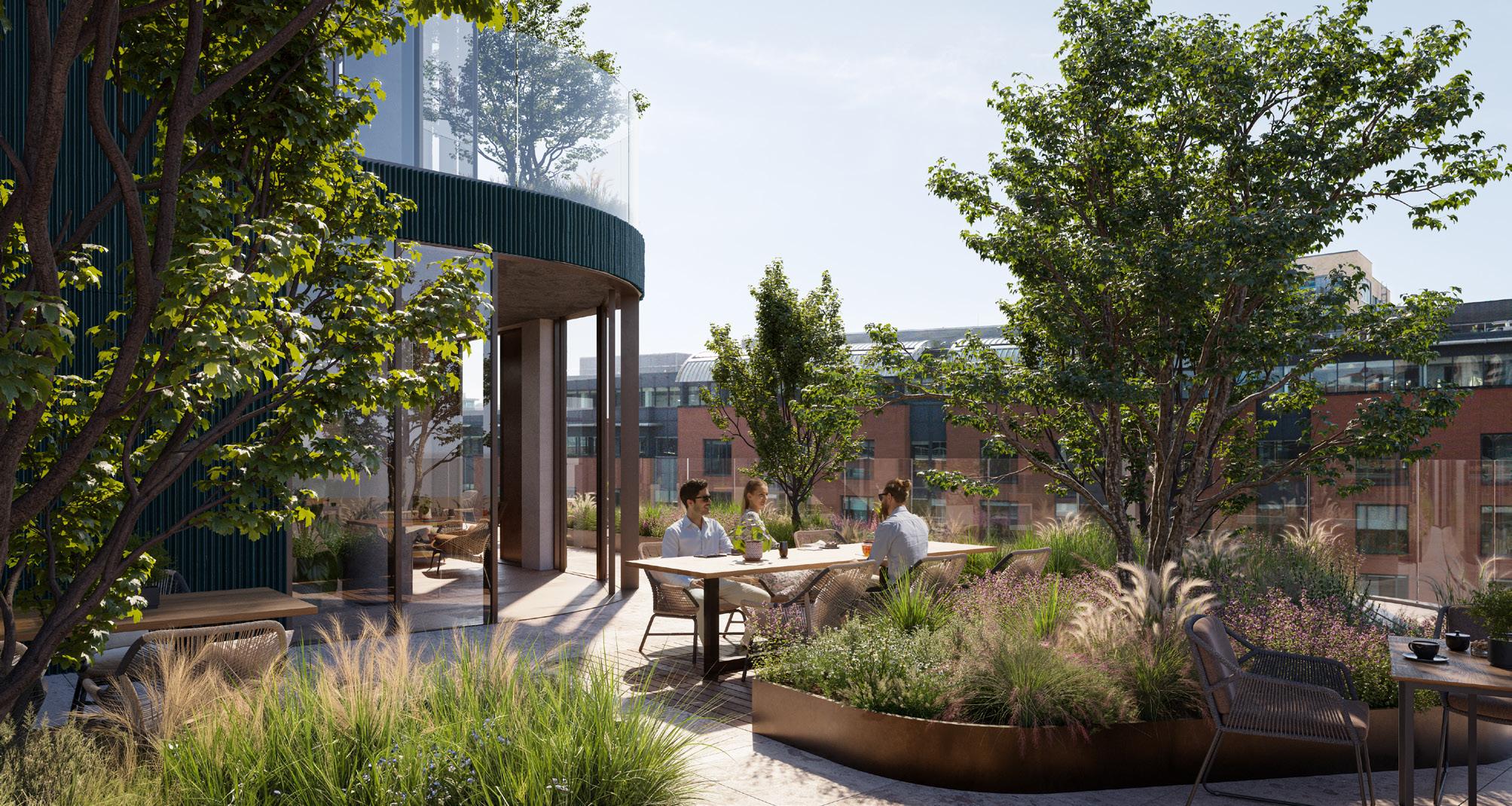 The larger occupier focused terraces include soft landscaping which contributes to the scheme’s biodiversity net gain of 167%. This is significantly over the current guidance of 110% gain. A key focus of the design is the communal and amenity spaces linked with landscaping and terraces green in more ways than one.