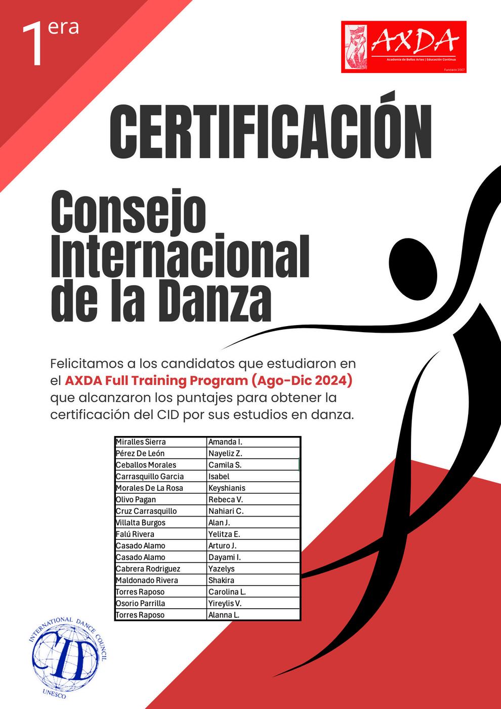 Esta es la primera vez que bailarines de AXDA, recibirán la certificación del Consejo Internacional de la Danza, esta se recibe al completar los estudios de los programas especializados del AXDA Full Training Program (desde la categoría Kids en adelante) y del Programa Pre-Profesional en la que hayan completado 150 horas de estudio o más, equivalentes a un 70% o más de asistencia a su programa de estudios
