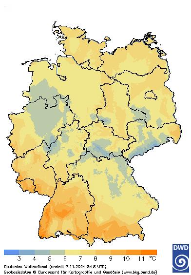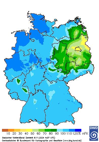 A felső talajrétegekben a talajnedvesség-szintek a Német Meteorológiai Szolgálat közzétett adatai alapján teljesen telített talajokat mutattak november elején – Északkelet-Németország kivételével. A talaj víztartalma jelentősen befolyásolja talajhőmérsékleteinket is. Míg a kora tavasszal nyugatról érkező langyos eső gyorsabban felmelegíti a talajt, őszszel a telített talaj csökkenti a talajban lévő levegő arányát, így az lassabban hűl. A talajban lévő nagyobb anyagtömeg inertebben reagál a napközbeni hőingadozásokra is. Következésképpen,