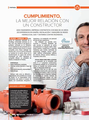 LA MEJOR RELACIÓN CON UN CONSTRUCTOR ASSV INGENIEROS, EMPRESA CONTRATISTA CON MAS DE 40 AÑOS DE EXPERIENCIA EN DISEÑO, INSTALACIÓN Y ASESORÍA DE REDES HIDRÁULICAS, GAS Y SISTEMAS CONTRA INCENDIOS. ÁLVARO SABBAGH ES profesional en ingeniería, egresado de la Pontificia Universidad Javeriana en el año 1977, año desde el cual ejerció su profesión enfocado en la hidráulica. Con la experiencia de la empresa de su padre, posteriormente forma su propia compañía como Álvaro Sabbagh San Vicente SAS y con la cual ha construido un nombre en el sector, ahora con la transformación en marca del nombre empresarial por ASSV ingenieros, la compañía ofrecen un portafolio de diseño e instalación en fluidos. PORTAFOLIO Redes hidráulicas y sanitarias. Sistemas contra incendio a base de agua. Redes de acueducto y alcantarillado. Redes de gas. Aunque cada rama es diferente y especializada, este portafolio de manejo de fluidos es su especialidad como contratistas, que abarca el equipo de diseño, con coordinador, dibujantes e