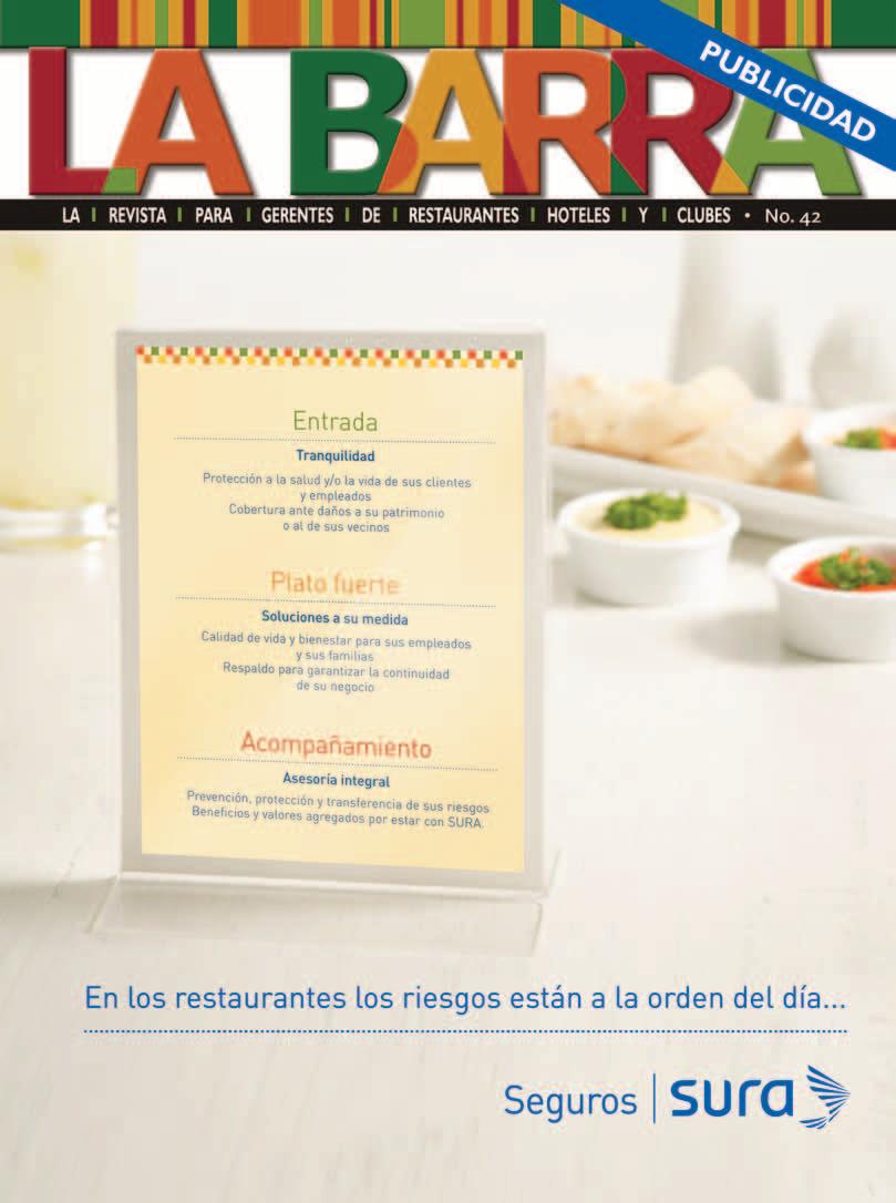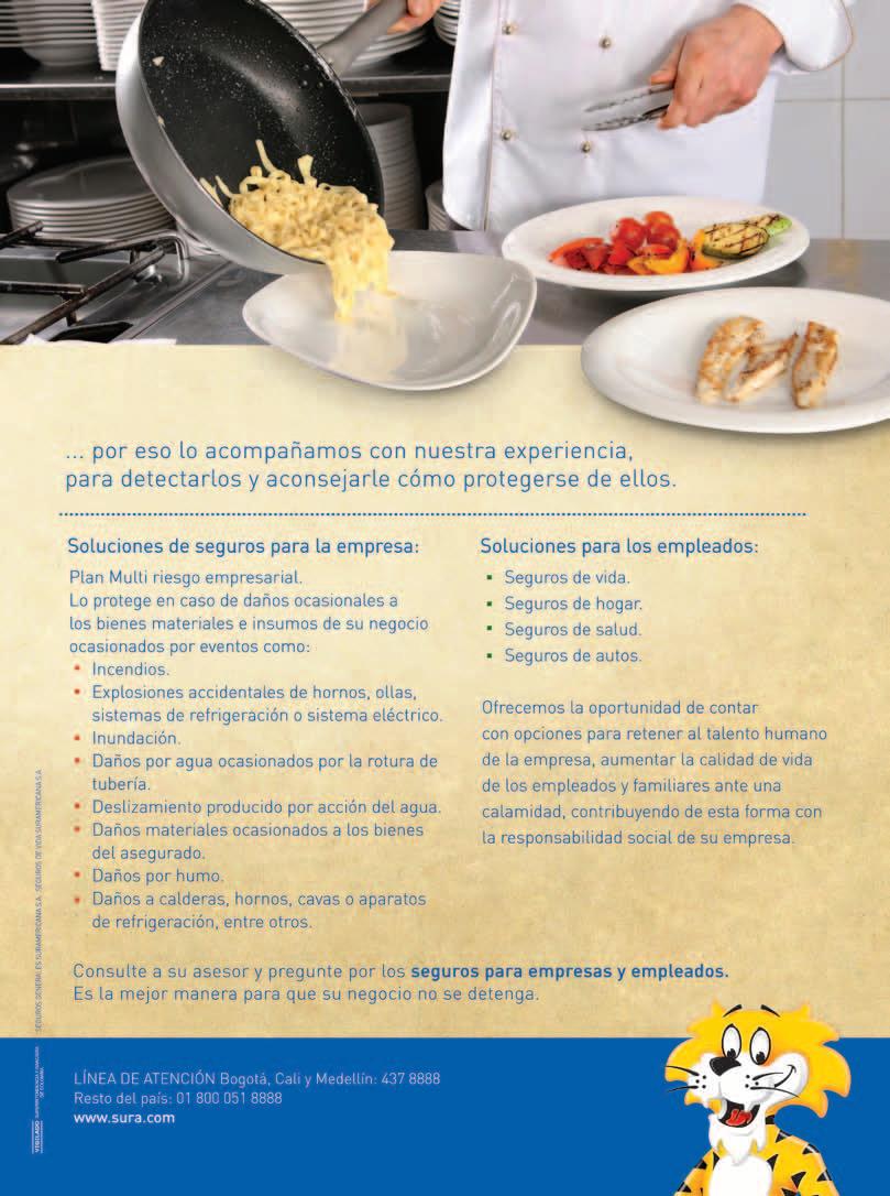 Por un error involuntario en el artículo "Un restaurante seguro, el mejor plato de su negocio", de la edición 41, se citó a Erika María Cano como Jefe de Mercadeo de la empresa Seguros Generales Suramericana. Aclaramos que el Gerente de Mercadeo de la Compañía es el Dr. Francisco Javier Duque Ossa y la información publicada acerca de la documentación necesaria para reclamar en caso de siniestros fue suministrada por Carlos Alberto Sánchez de Generali Colombia. Presentamos excusas a Seguros Generales Suramericana por los inconvenientes que se pudieran haber originado.