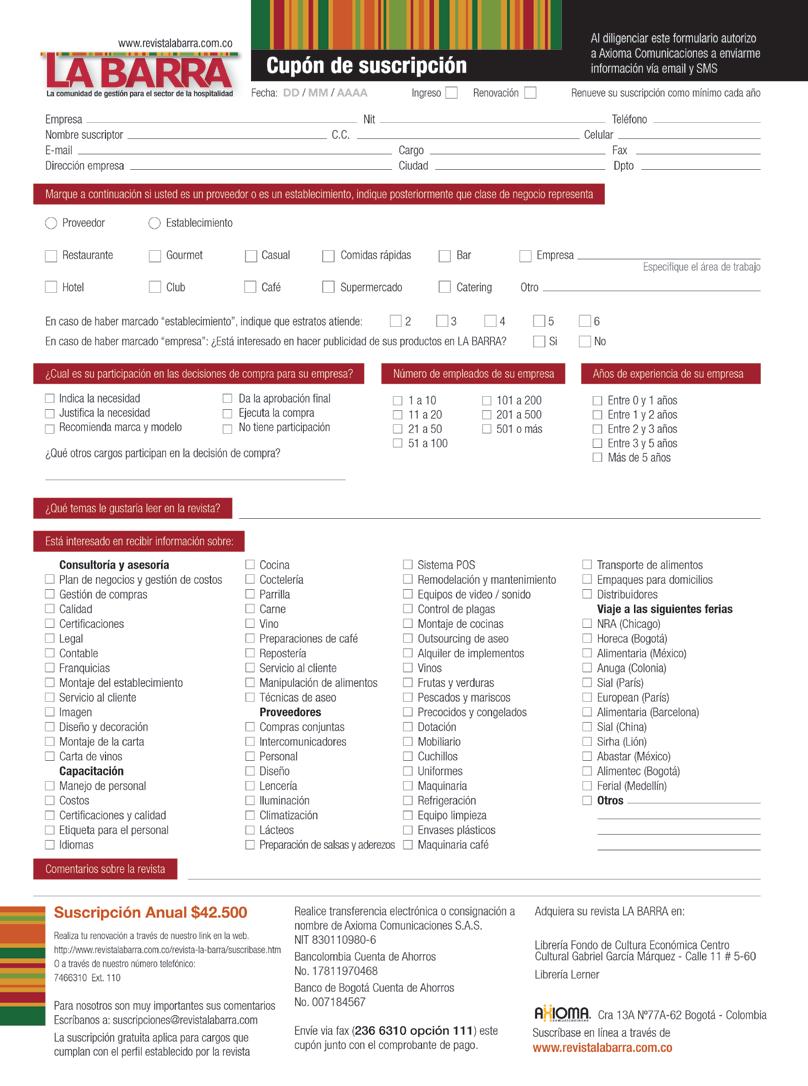 Coordinador de suscripciones OCTAVIO SÁNCHEZ Tel: 746 6310 ext. 128 analistadatos@axioma.com.co