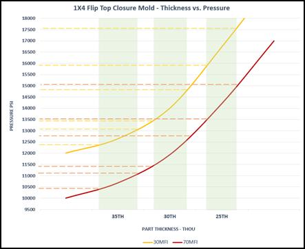 Material property fluctuations have big implications for the molding process, as illustrated below, changes in resin between 30 MFI and 70 MFI result in injection pressure variations that lead to significant quality and efficiency issues in conventional injection molding systems. Per the chart below, such MFI swings can result in injection pressure changes as large as 20%, which can literally stall the cycle, or create scrap. A proven solution for this challenge is RJG's iMFLUX* process control.