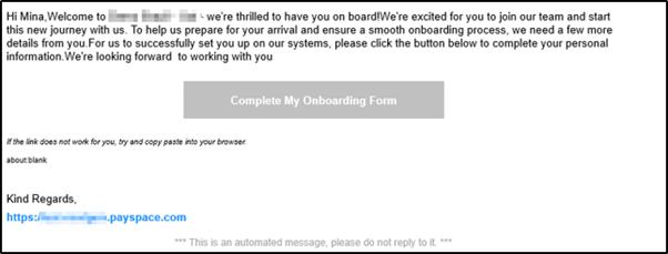 - Welcome email – A message and unique link is generated and sent to the New Hire email address, which they can access to complete their Employee Onboarding From, where they provide their personal details themselves.