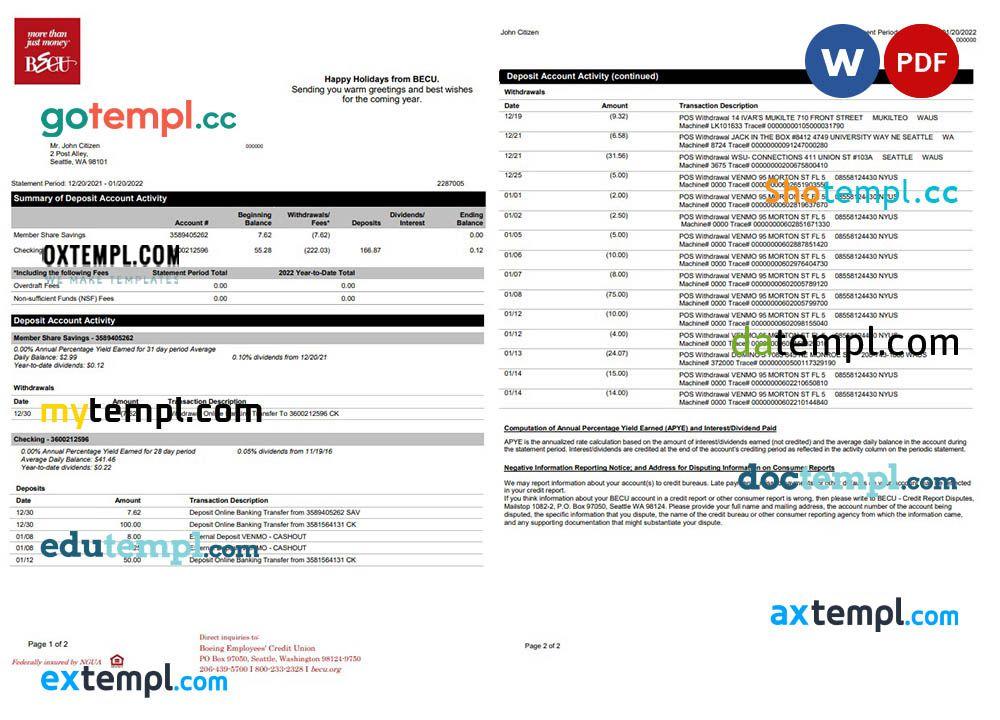 sample Australia BECU bank statement easy to fill template in Excel and PDF format, 2 pages download