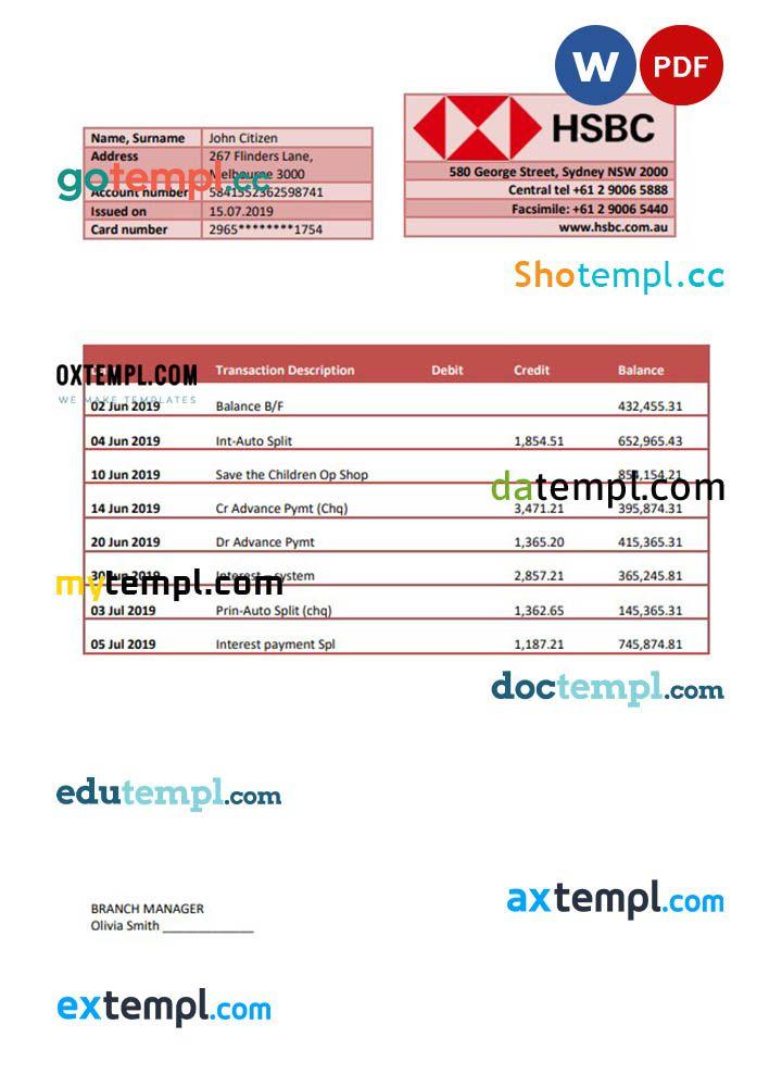 sample Australia HSBC bank statement, Word and PDF template, 3 pages download
